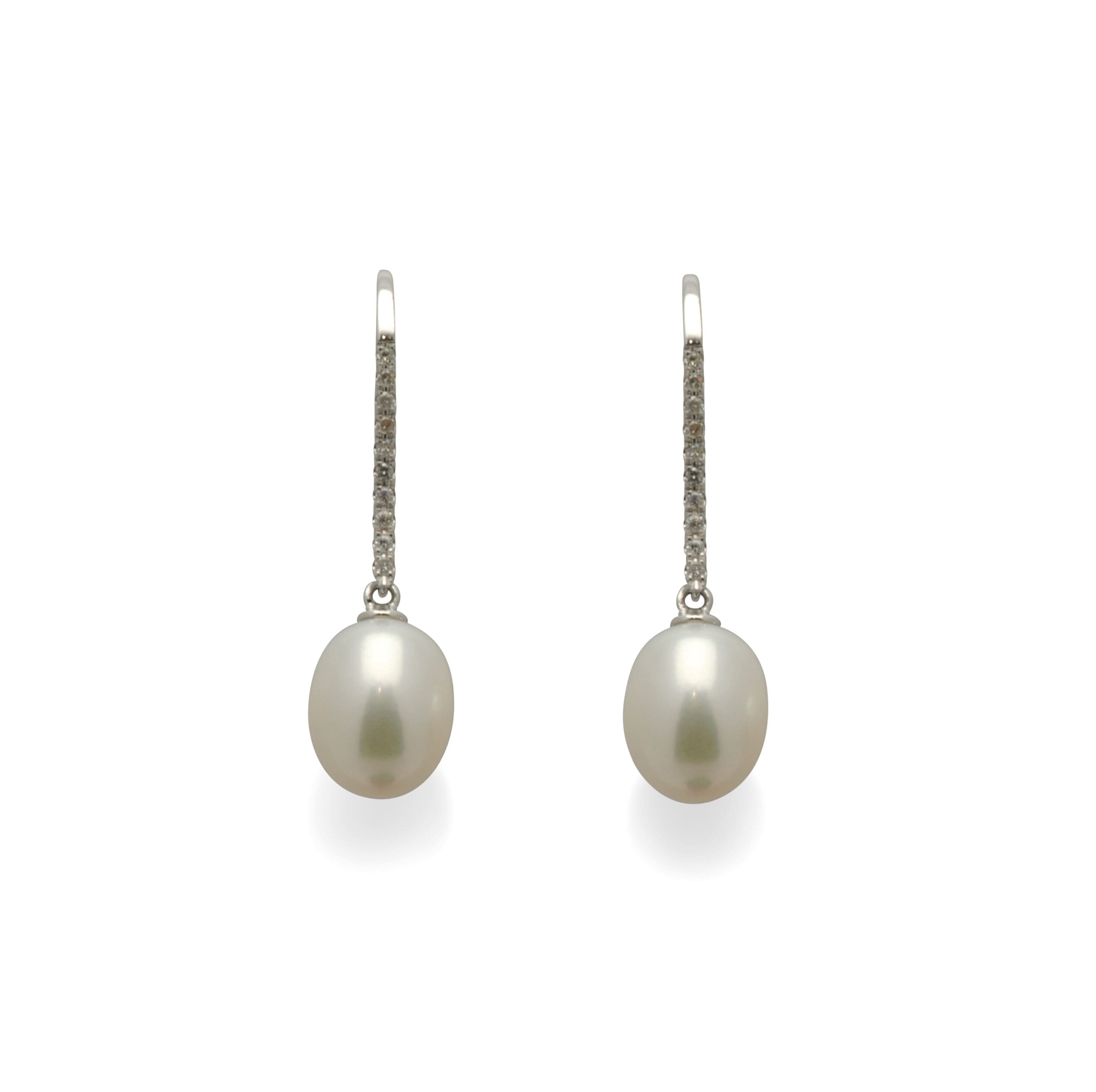 A pair of elegant modern white Pearl drop earrings pave set with round cut Diamonds.