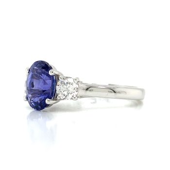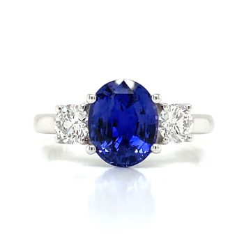 This impressive ring comprises a vivid cushion cut blue Sapphire within two generous princess cut diamonds. This sapphire is a certificated natural unheated Ceylon blue sapphire.