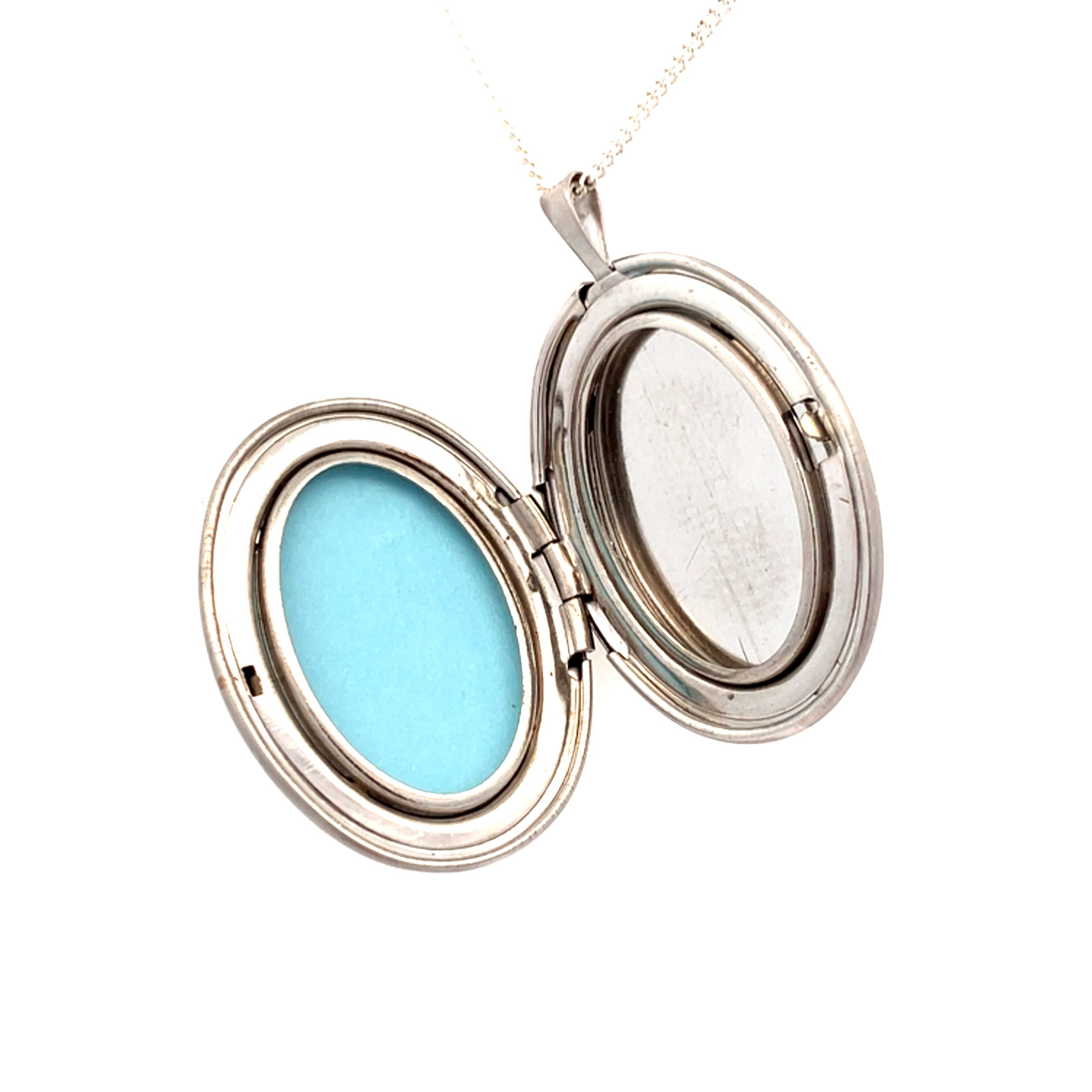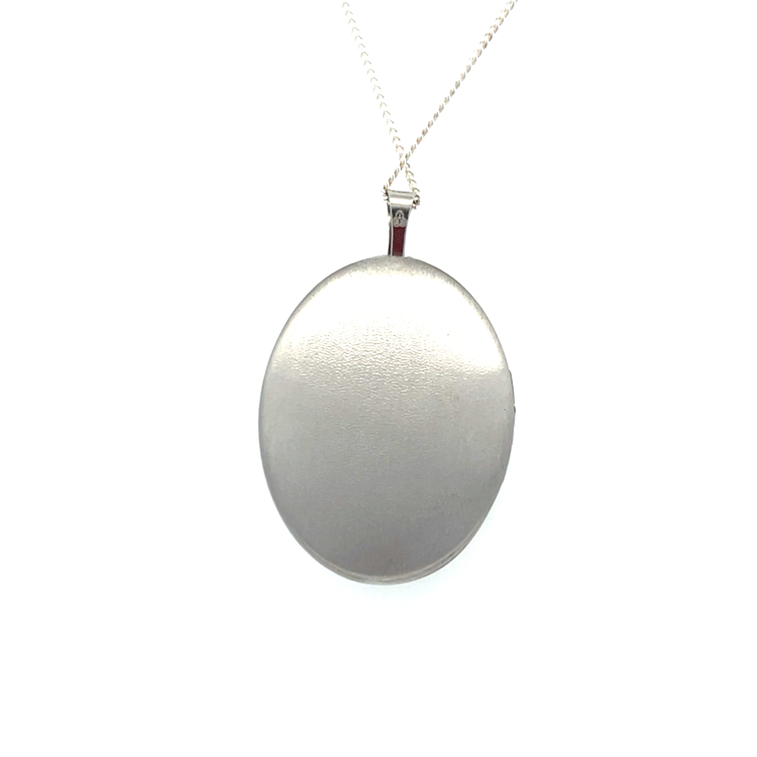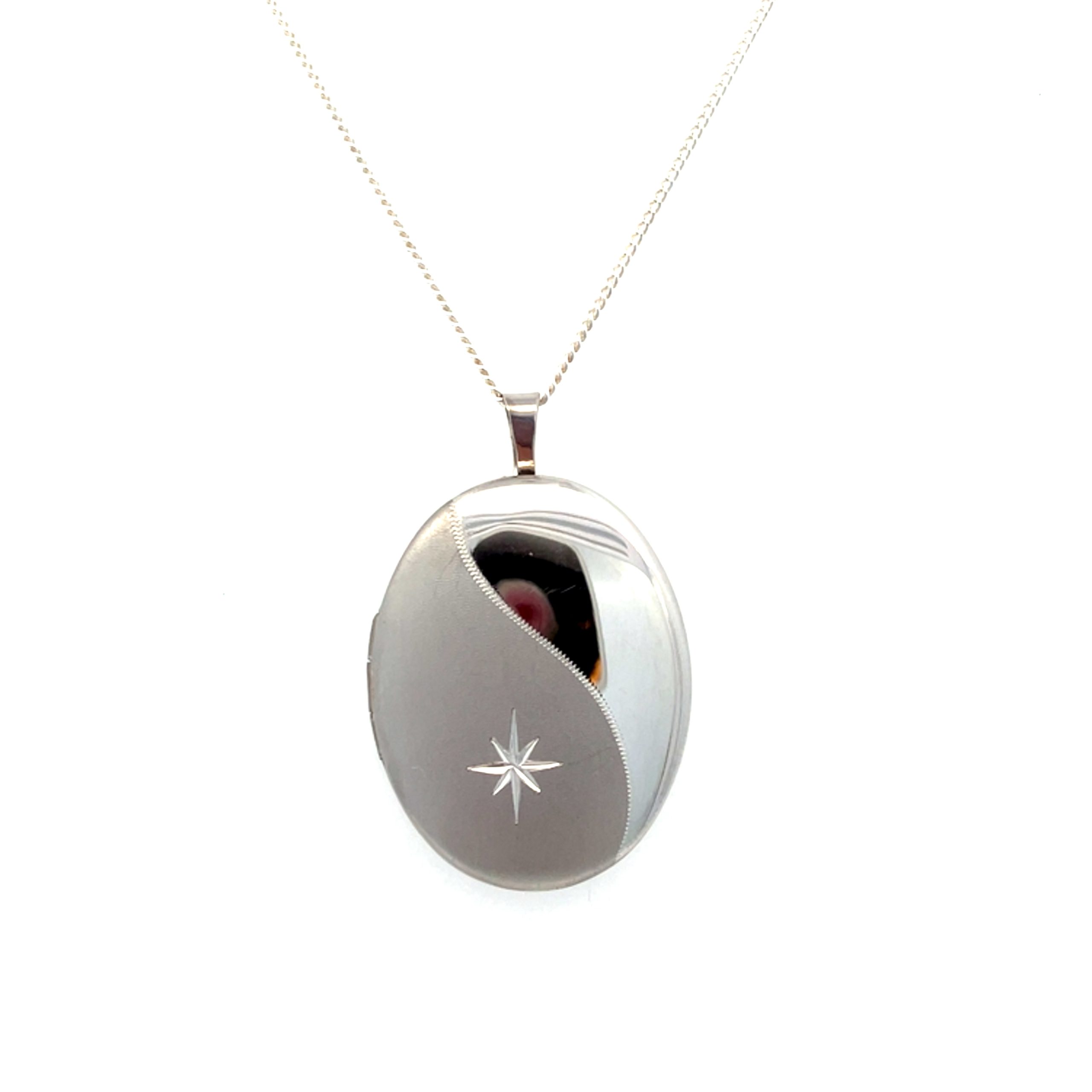 An oval silver picture locket with contrasting finishes and a bright cut star on the front and a satin brushed back. There are two photo frames inside. Comes with an 18 Inch flat curb chain.
