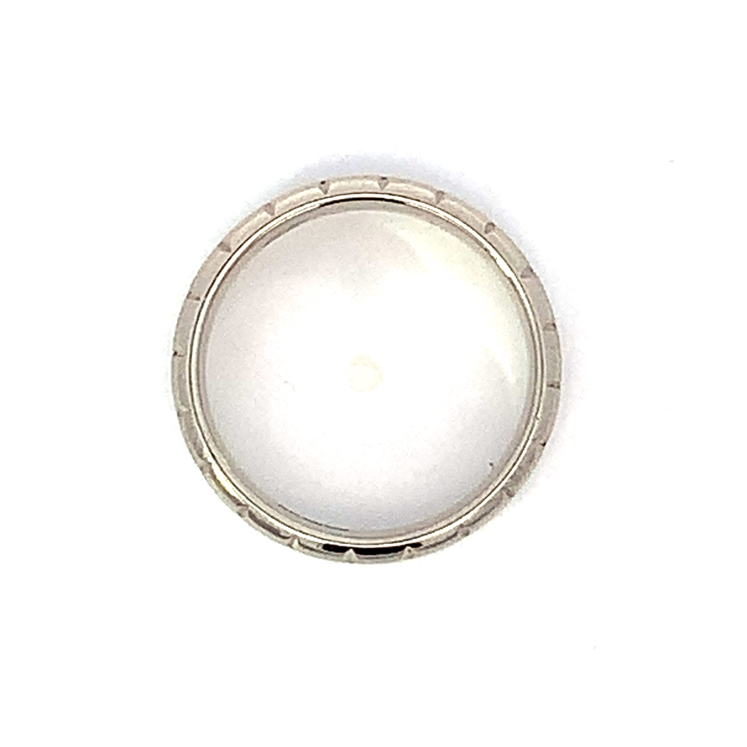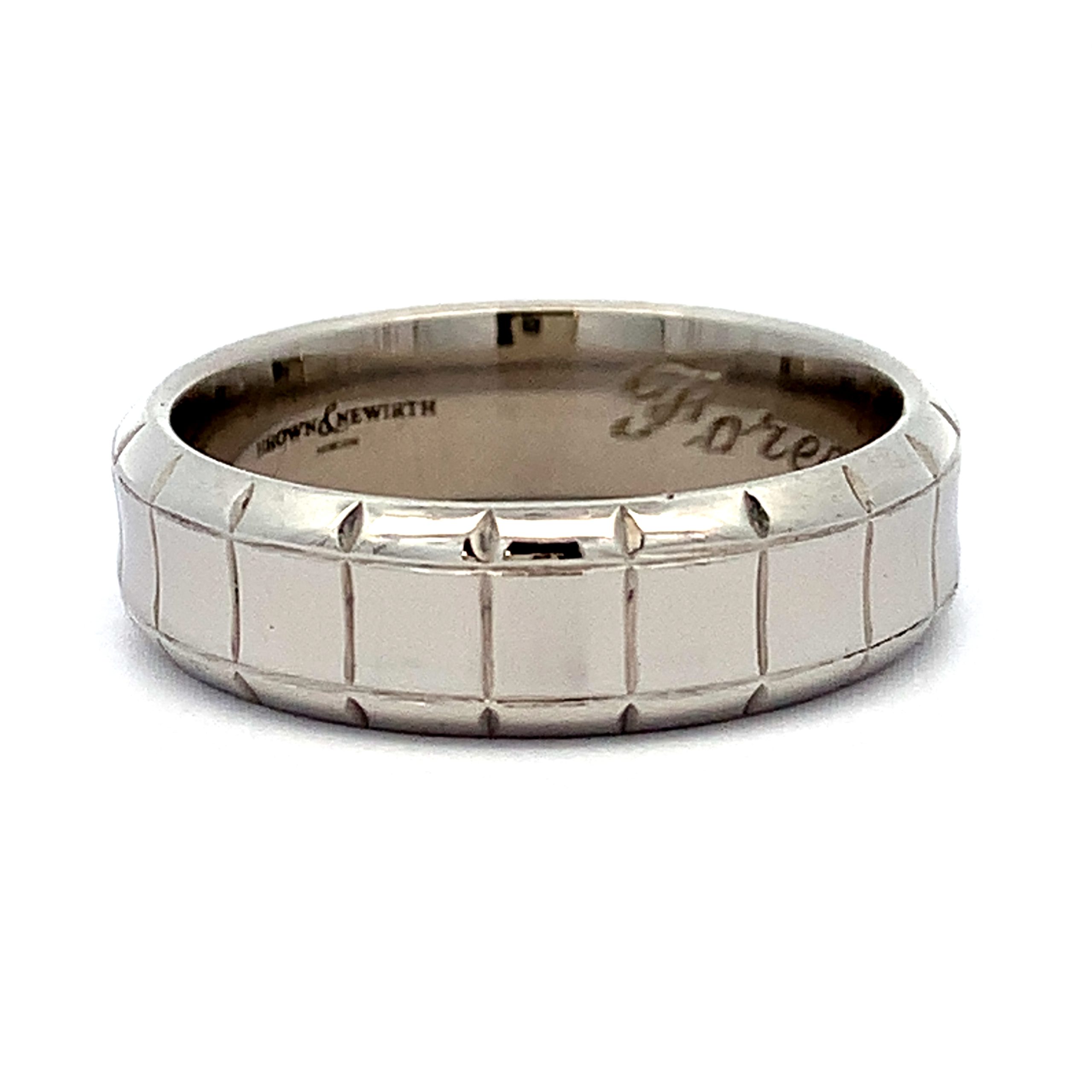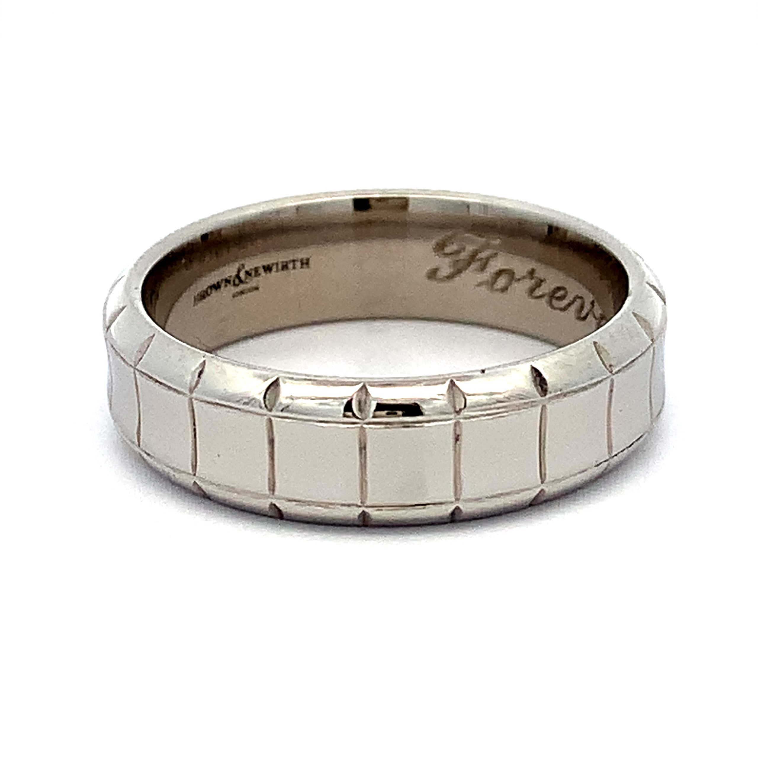 A heavyweight gent’s band with an unusual concave shape and linear detail.