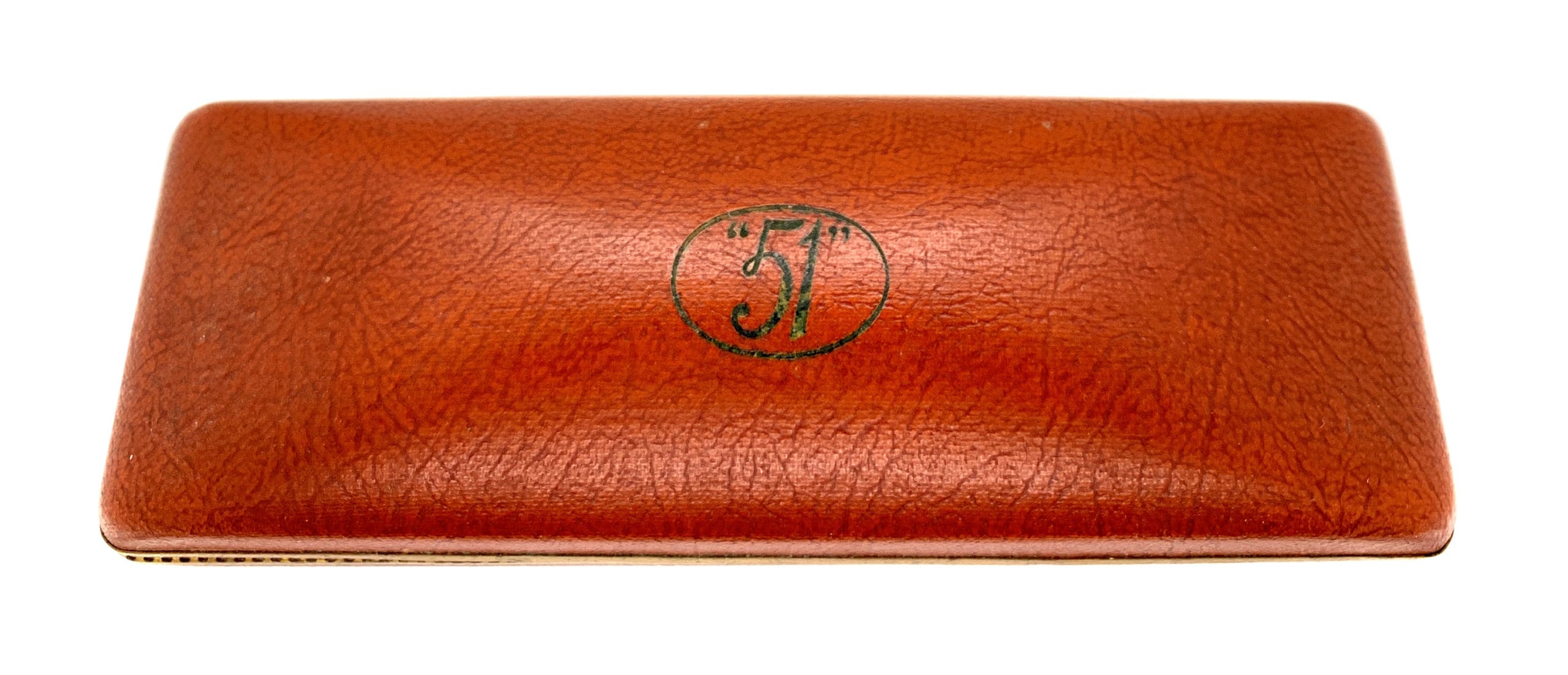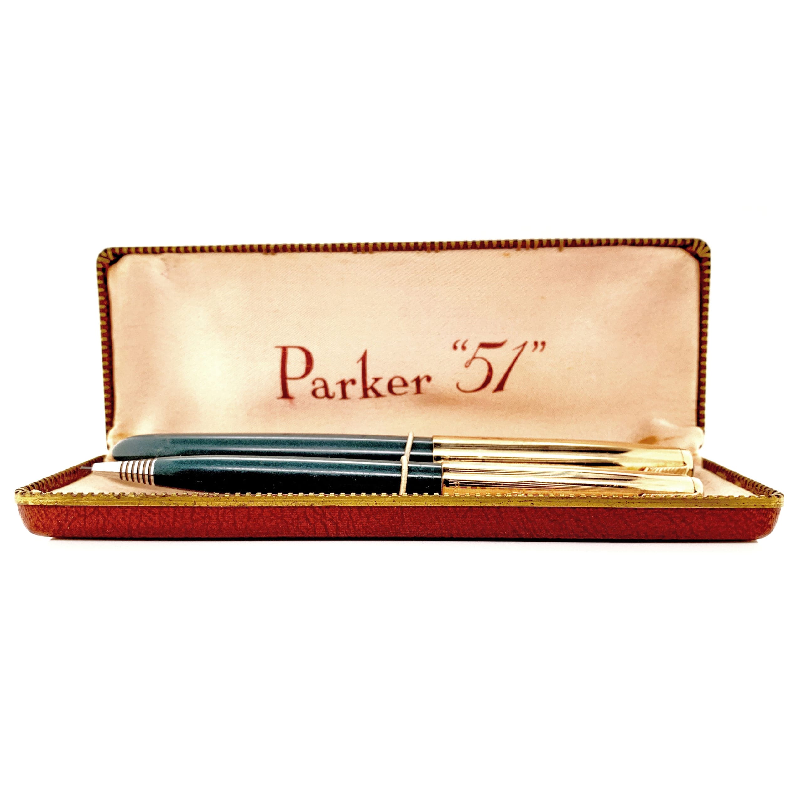 A vintage Parker 51 boxed set comprising the Aerometric Mk1 fountain pen and propelling pencil in good working order. With rolled gold caps, dove grey barrels and grey pearly ‘gem’ tops. The pen is fitted with a stainless steel reservoir with an easy-fill mechanism. Original snap-close box with “51” insignia. Comes with a supply of correct spare erasers for the pencil ( fitted under cap ). The barrel colour has photographed darker than actual colour which is dove grey.