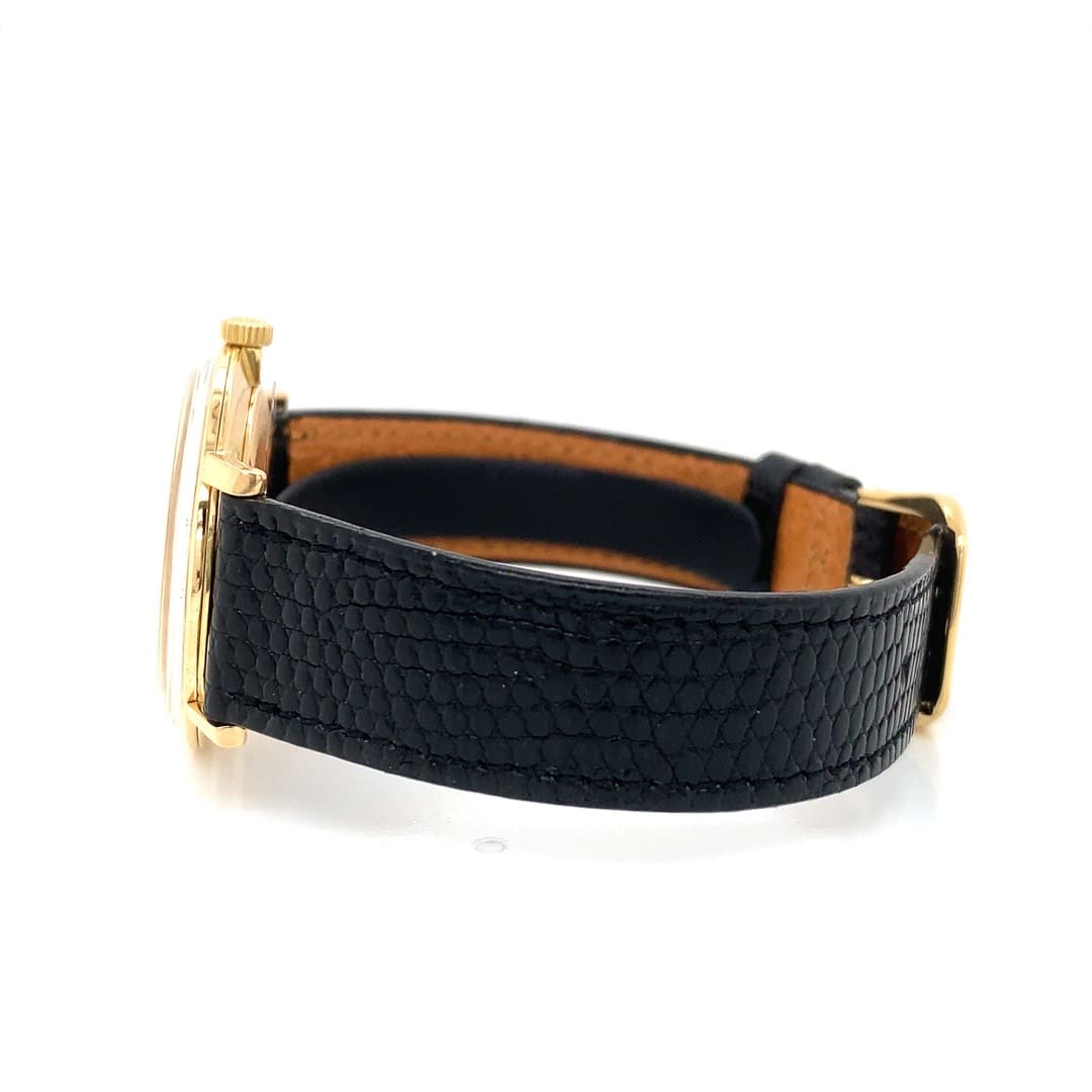 A beautifully refined 18ct gold watch by Patek Philippe. With a hand-wound mechanical movement in a slim minimalist case. Designed with simple black hands over a line textured matt dial punctuated with bright engraved hour markers.