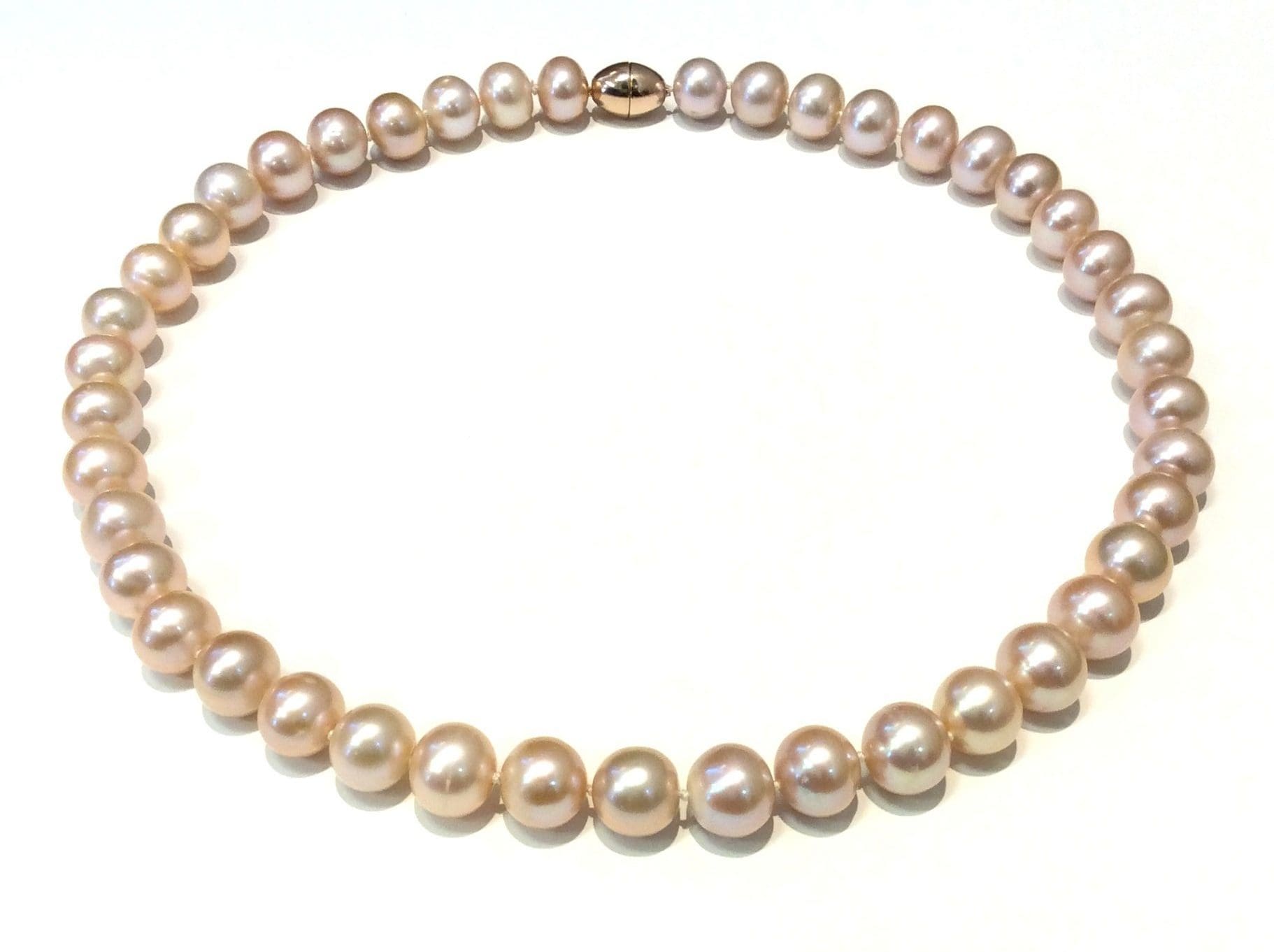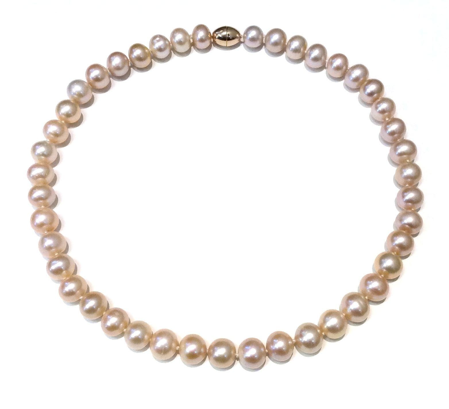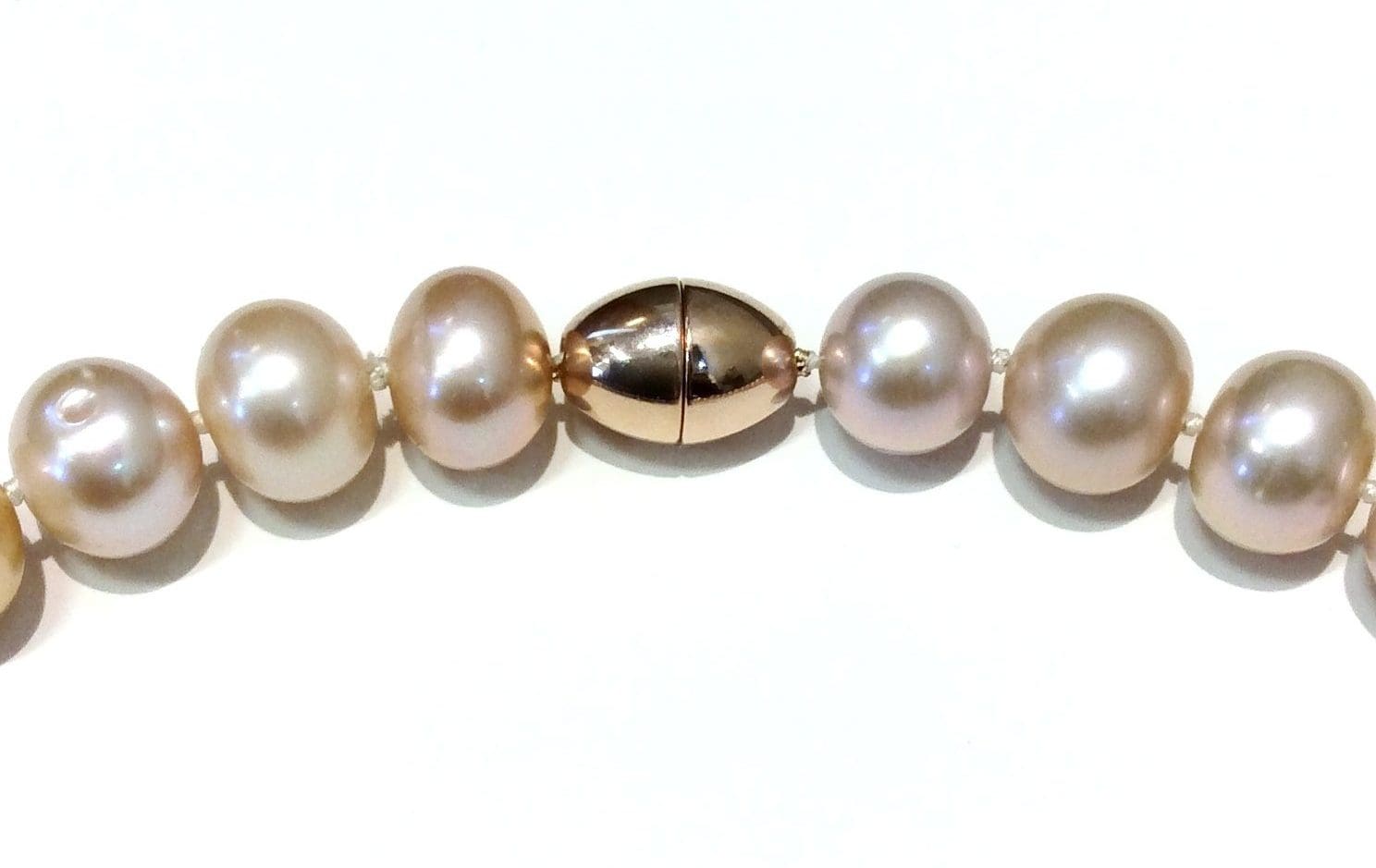 A pretty row of subtle peach pearls. This knotted string of semi-round freshwater pearls is fitted with a rose gold plated sterling silver magnetic clasp.