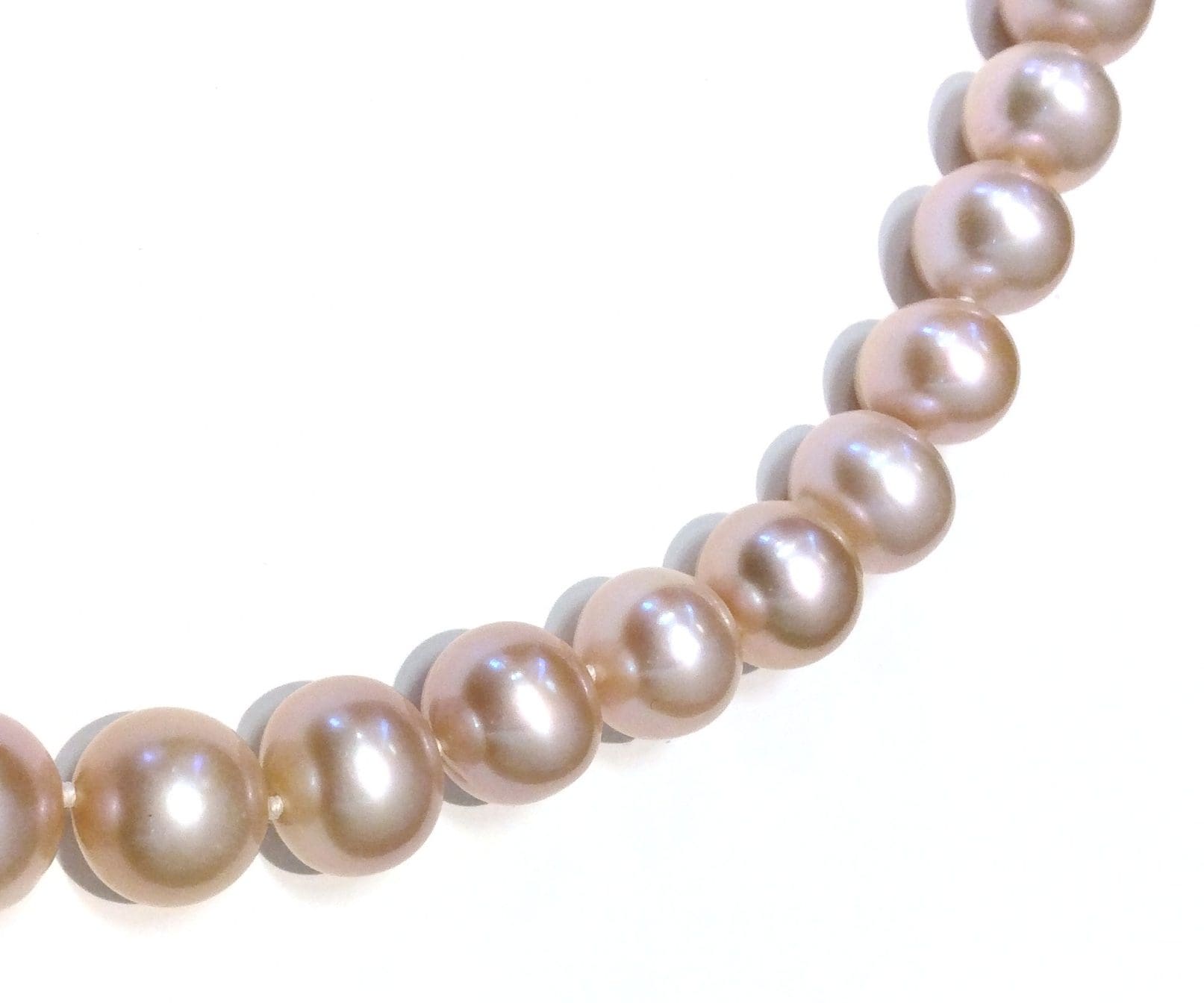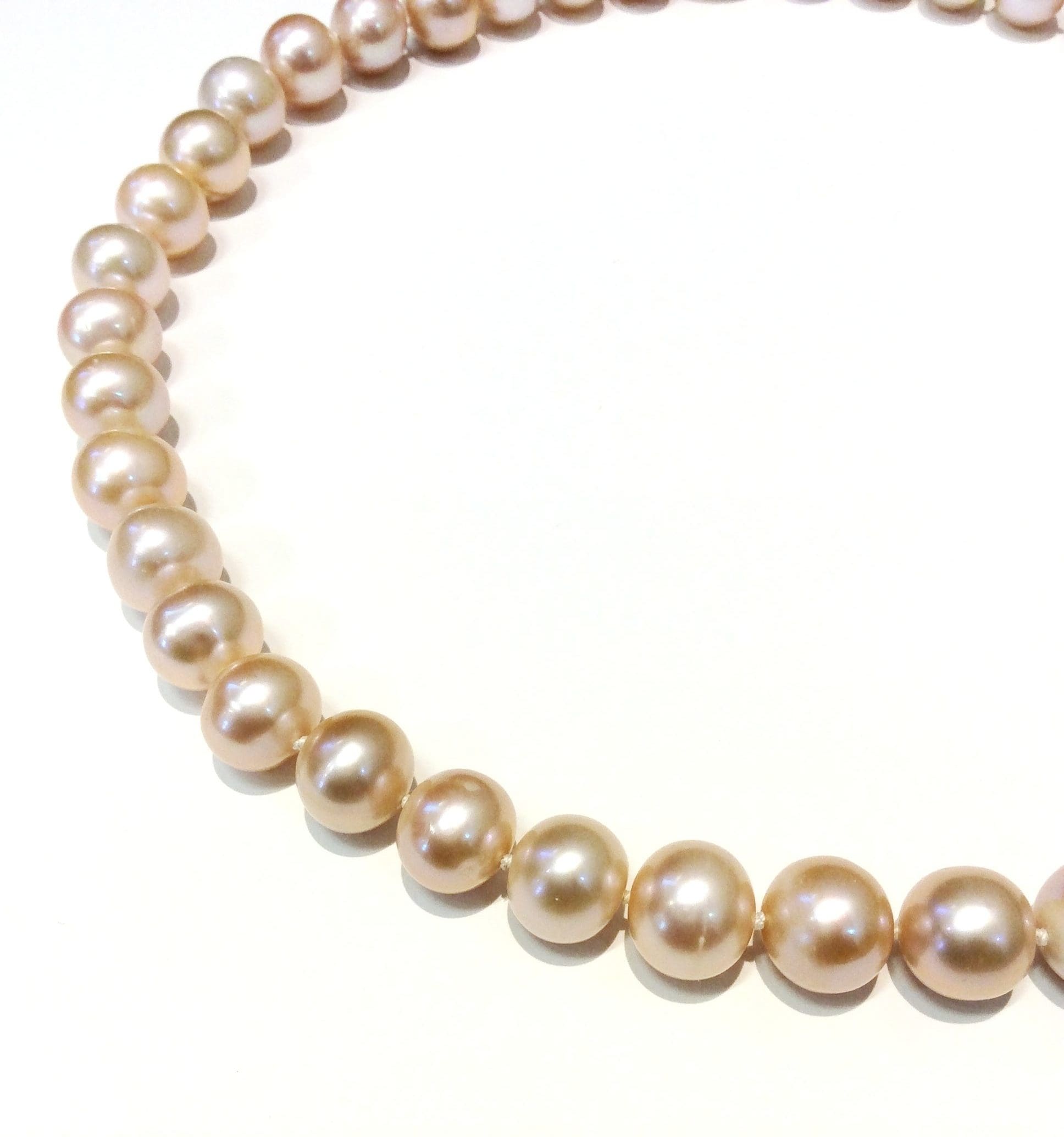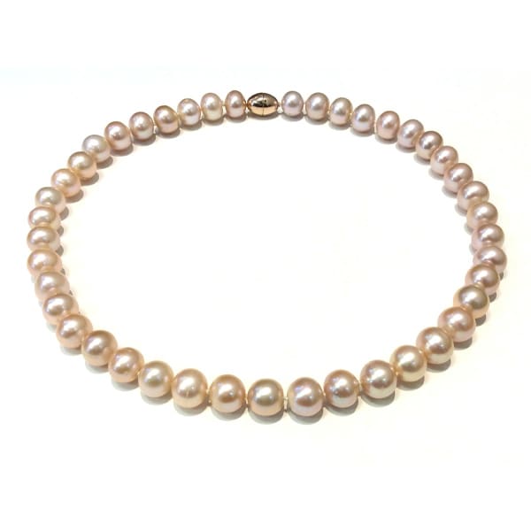 A pretty row of subtle peach pearls. This knotted string of semi-round freshwater pearls is fitted with a rose gold plated sterling silver magnetic clasp.