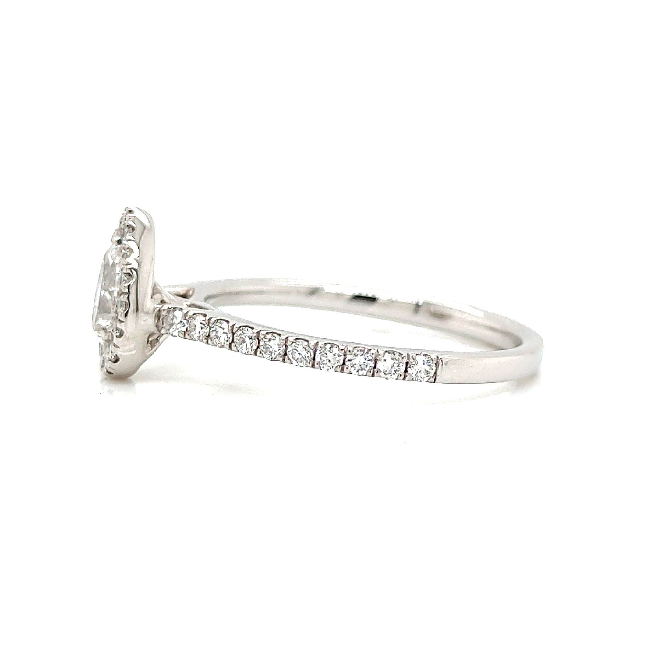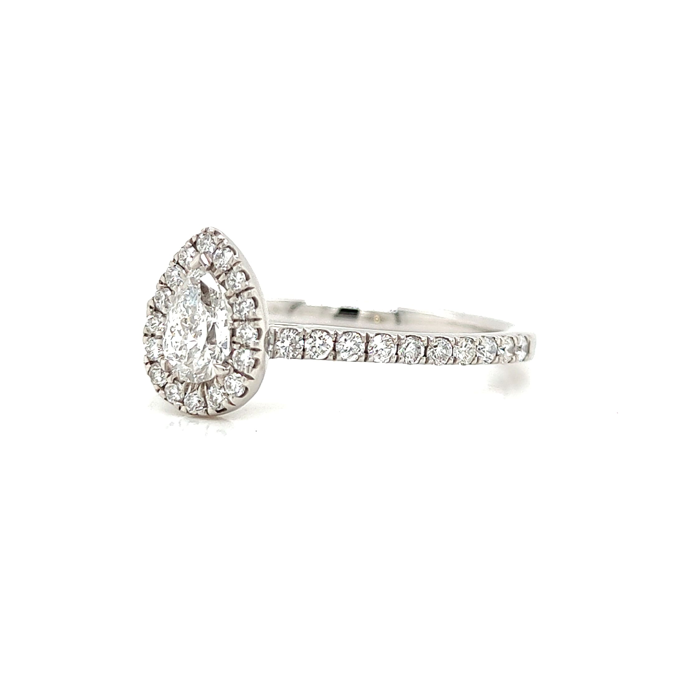 A beautiful pear cut diamond claw set within a diamond pave frame and made with diamond pave shoulders. This platinum ring is designed to allow a wedding band to sit under the setting.