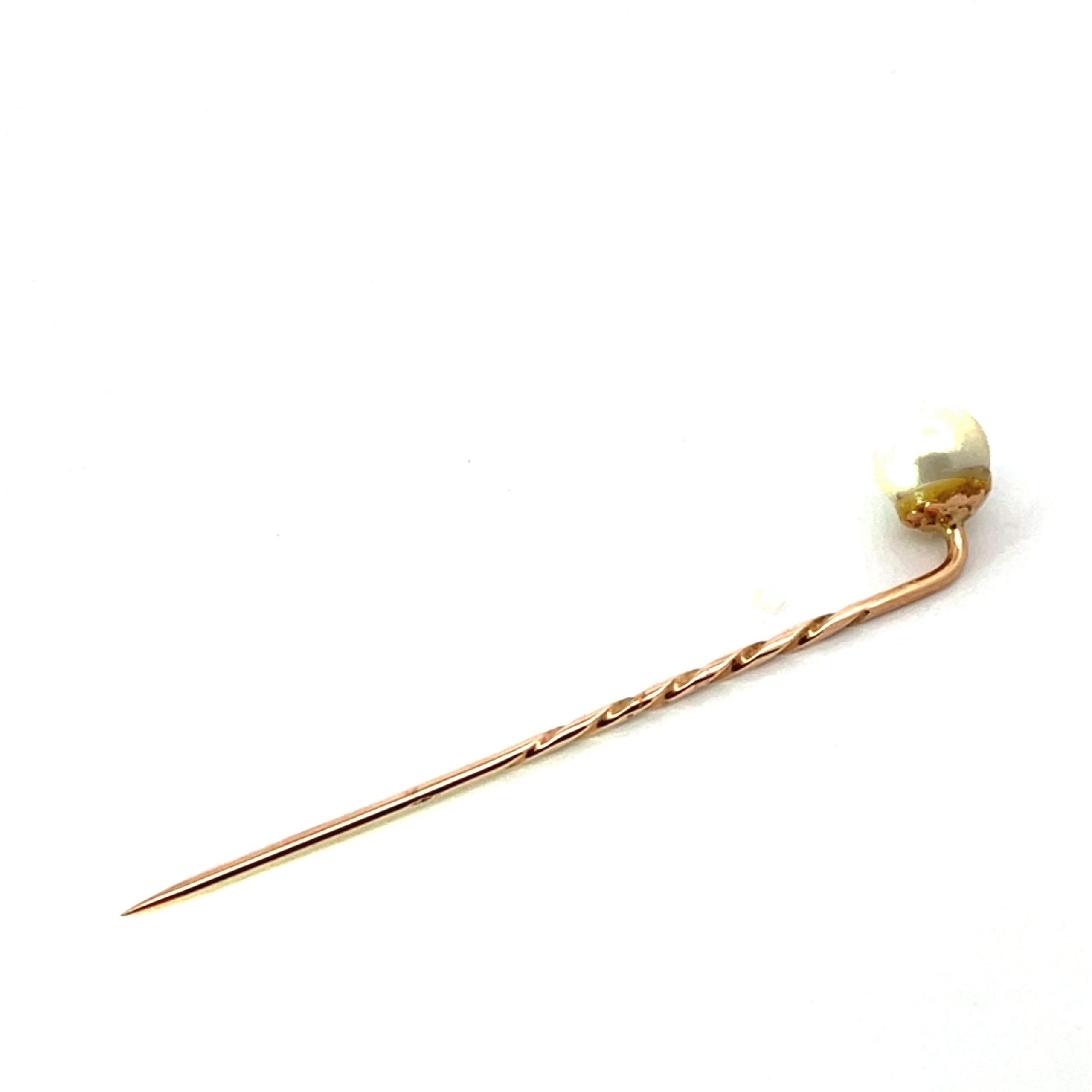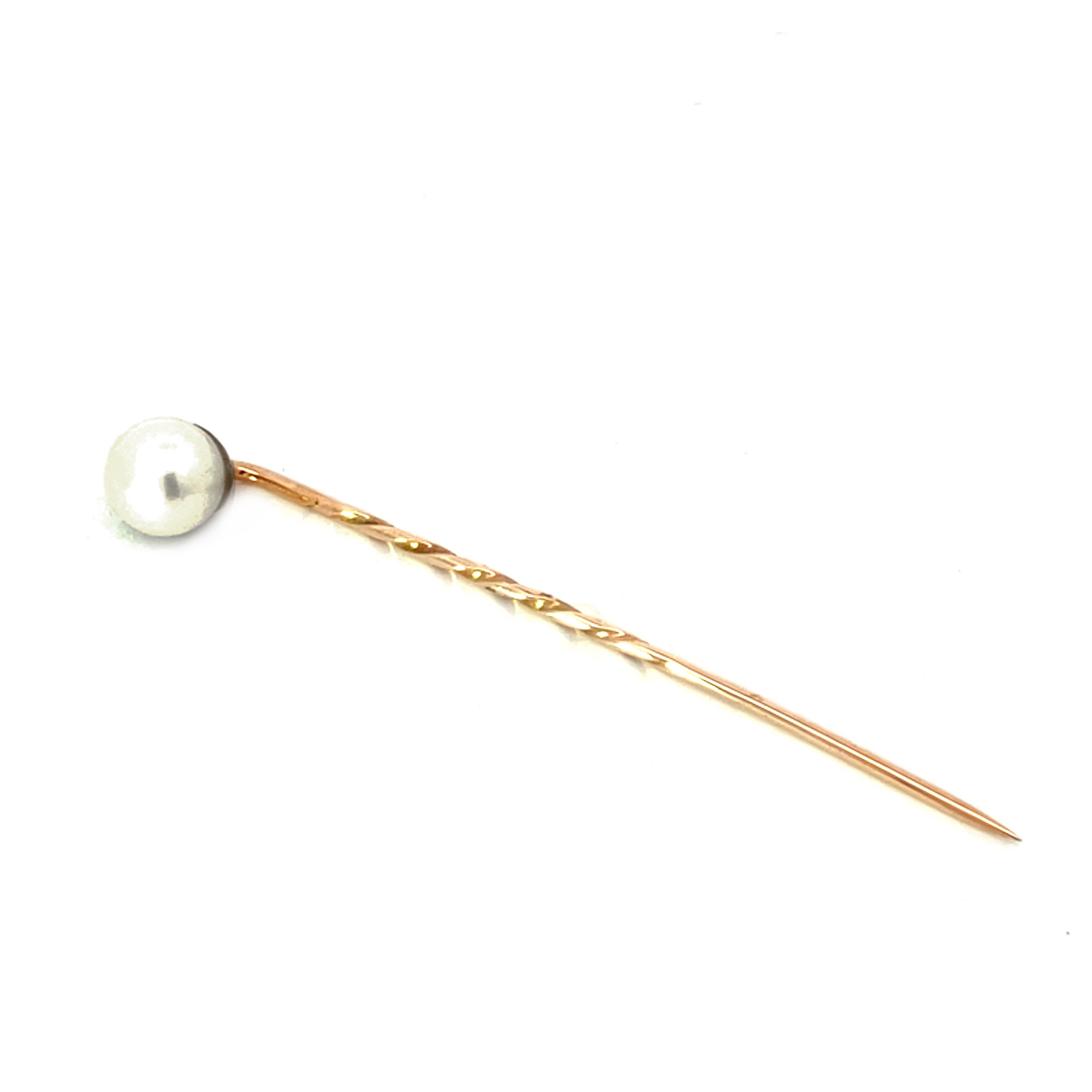 A good quality pearl atop a yellow gold stick pin.