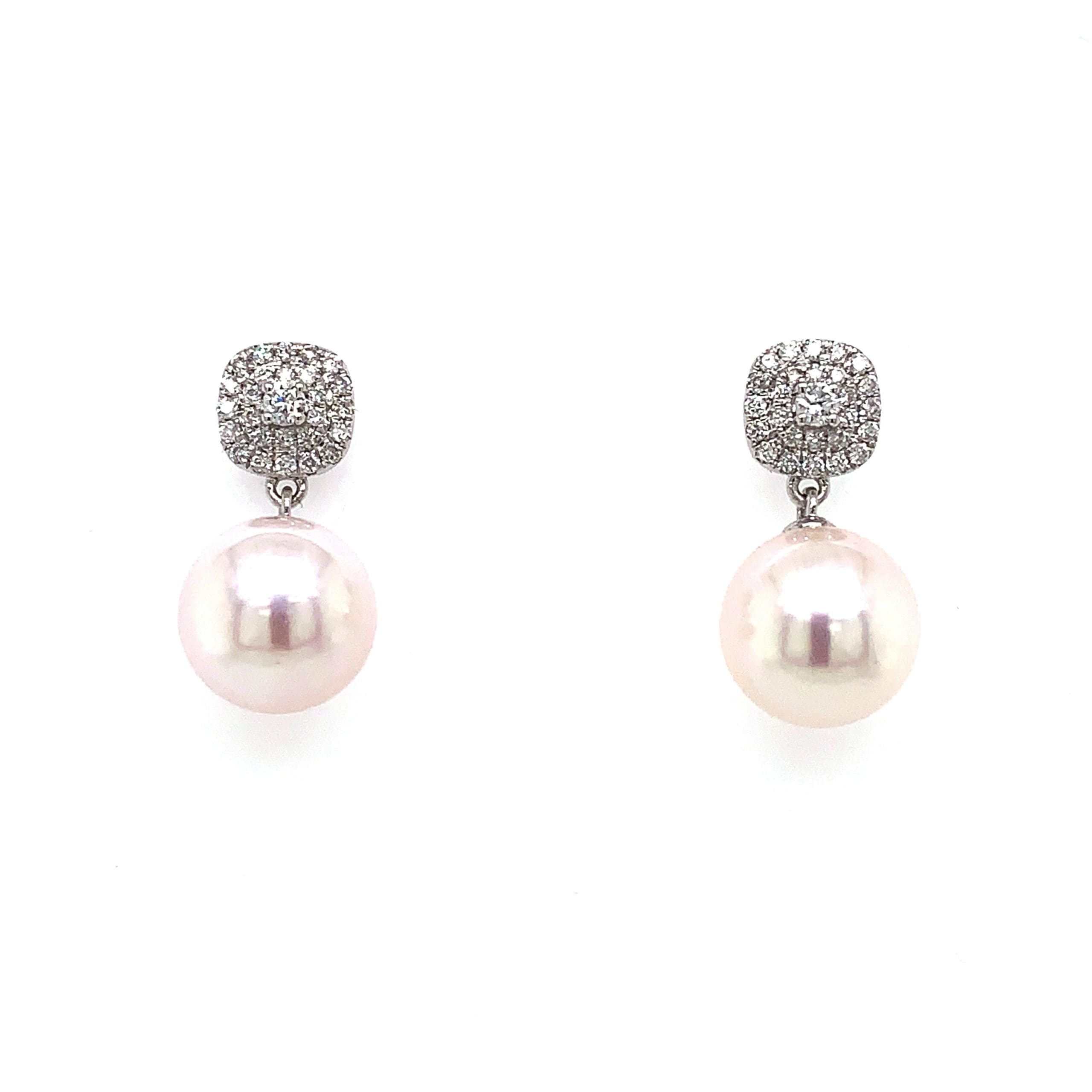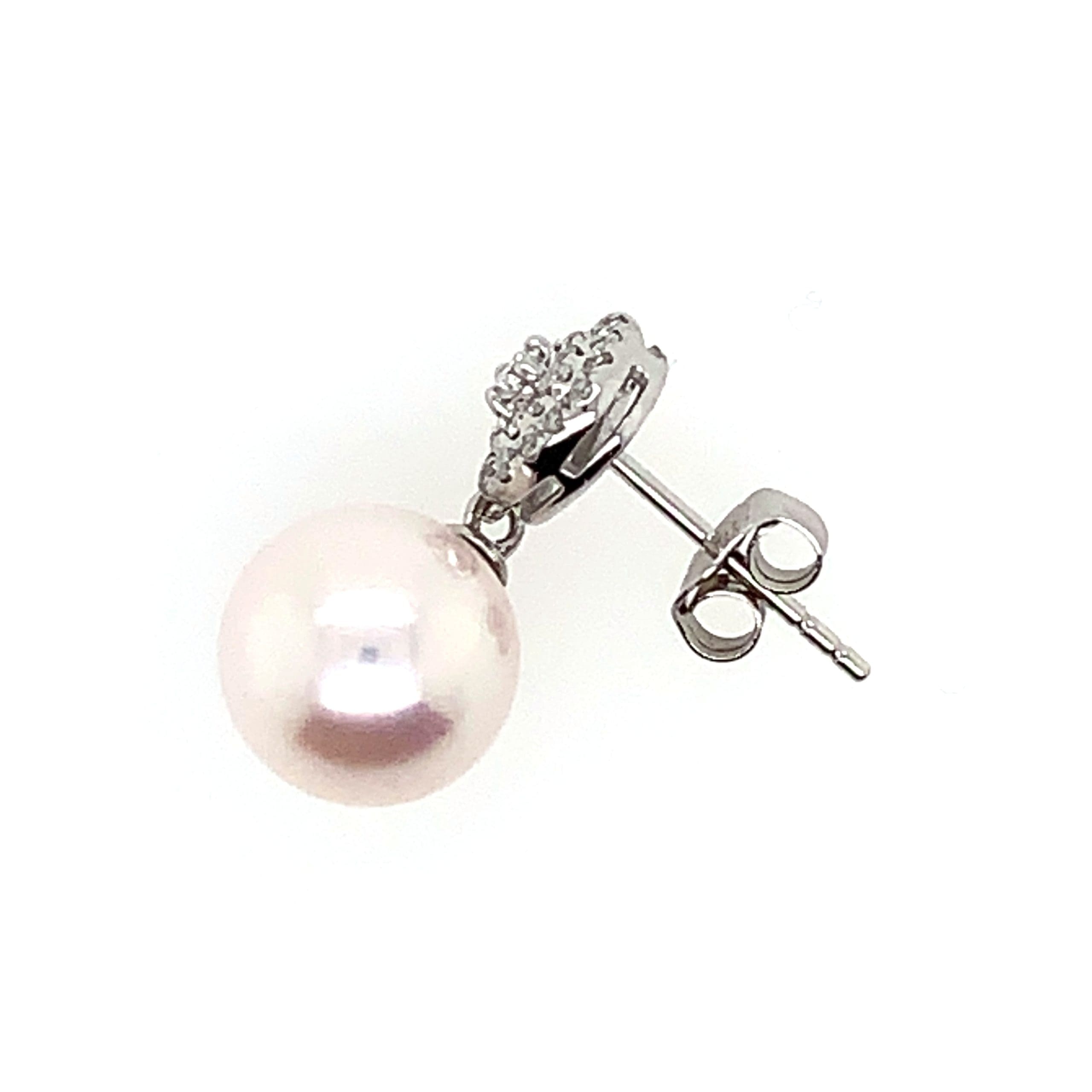 A cushion shape top fully set with bright Diamonds above perfect round pink / white swaying pearls.