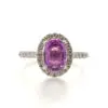 A vibrant oval faceted pink sapphire in a four claw setting surrounded by a pave set oval diamond halo and pave diamond set shoulders.