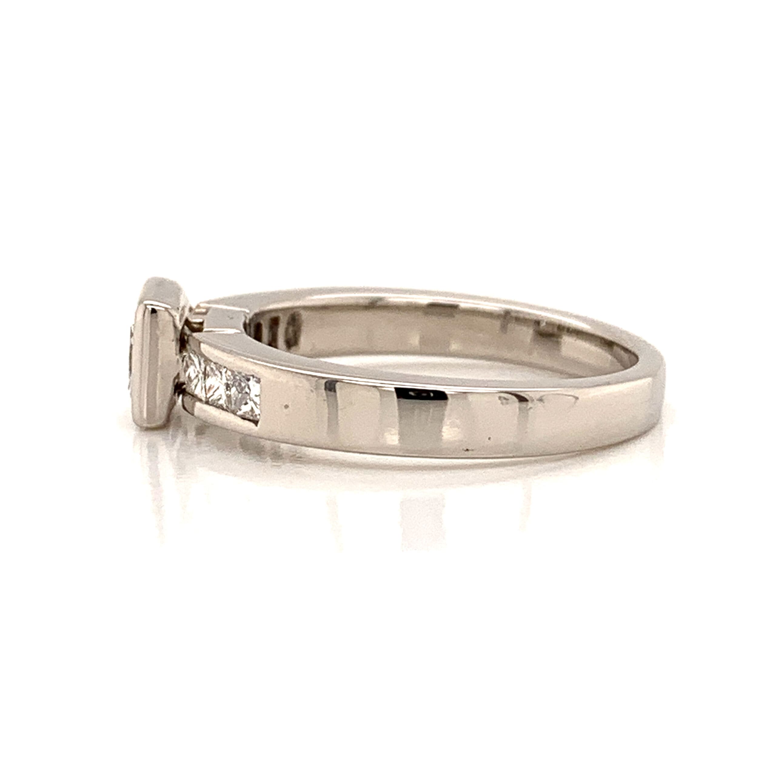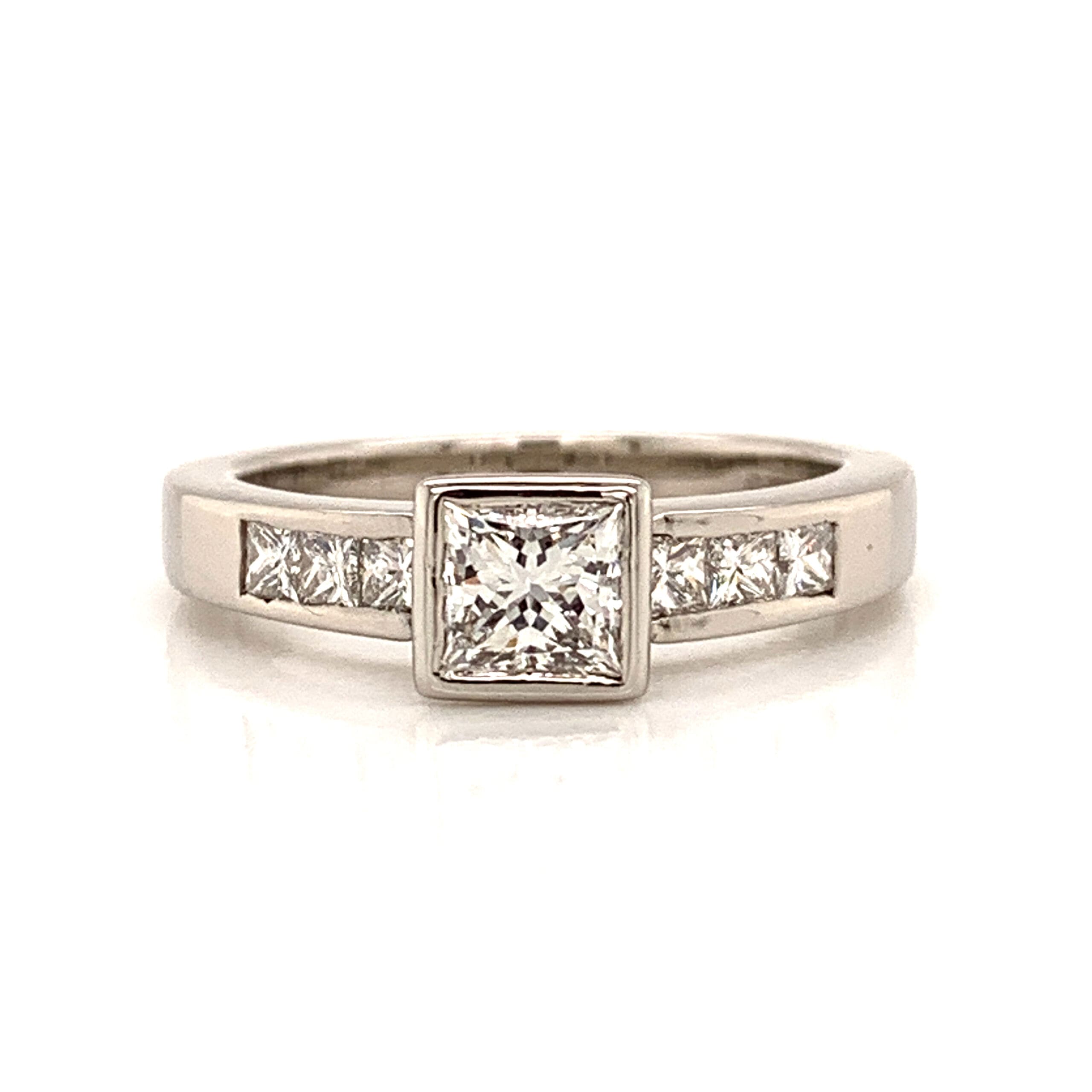 This modern platinum solitaire ring has a weighty shank with a ‘floating’ burnished setting. Set with a beautiful princess cut diamond of good colour and clarity. In very good condition.