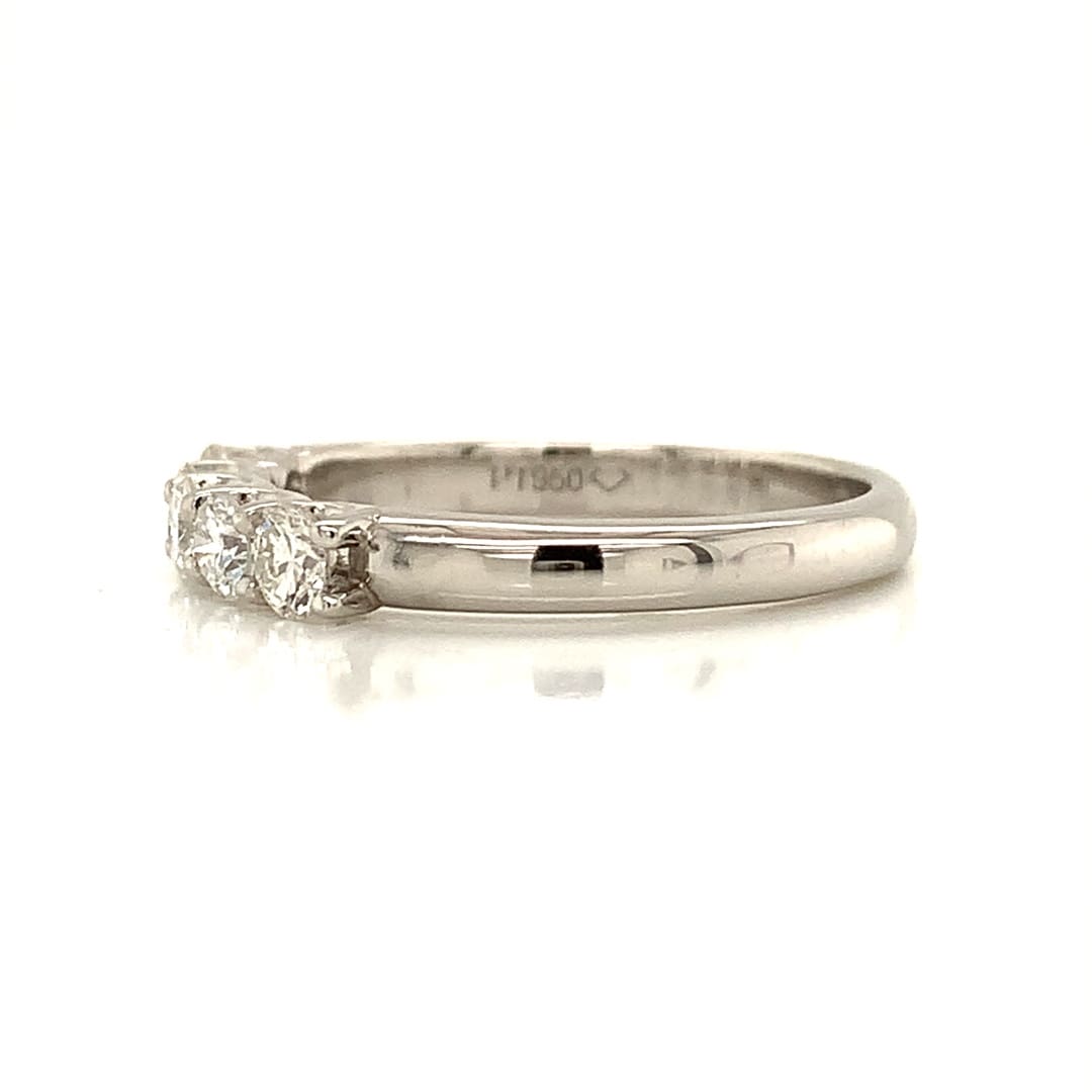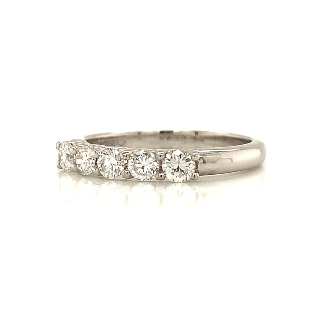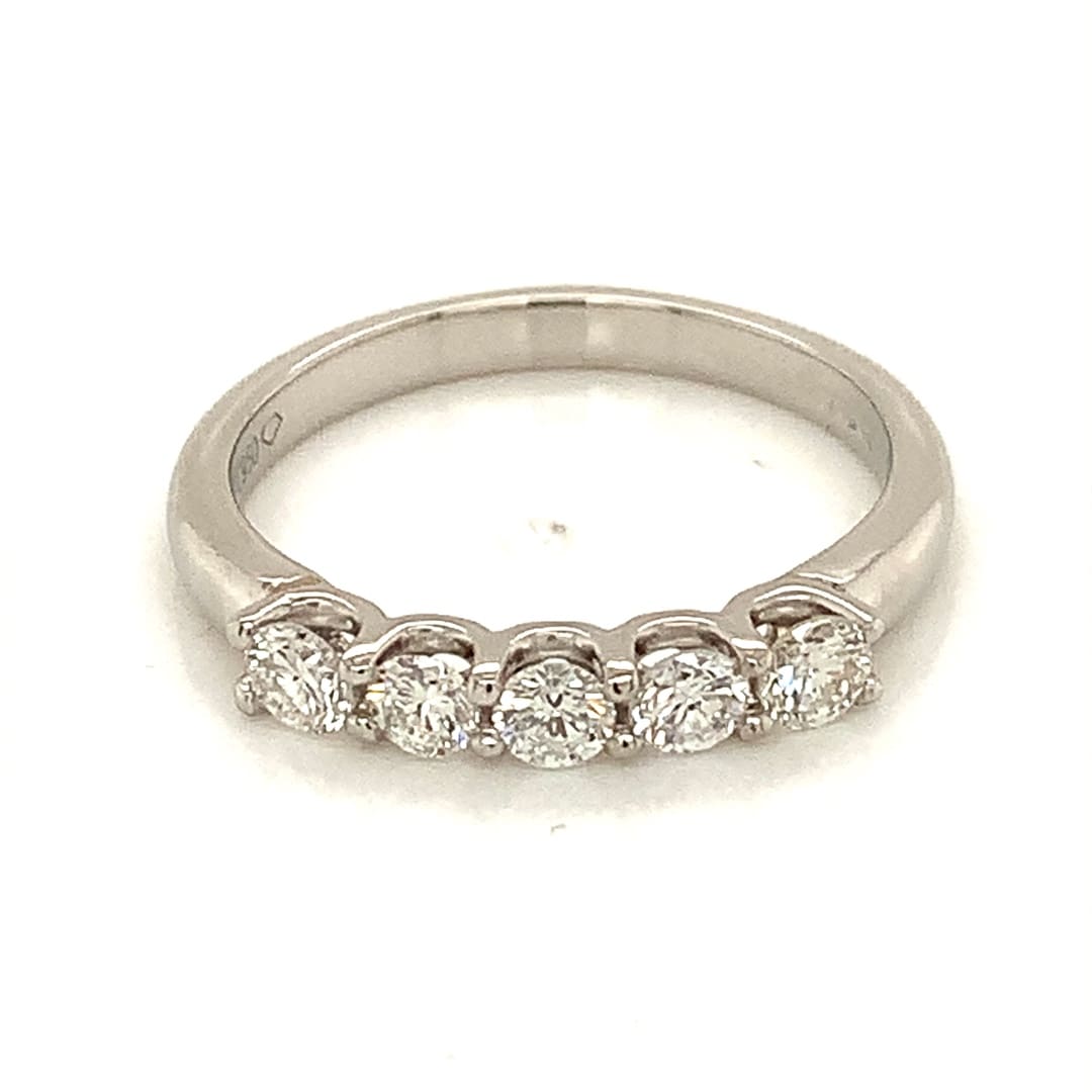 A beautiful band style eternity ring, with five bright brilliant cut diamonds in a scalloped open sided setting.