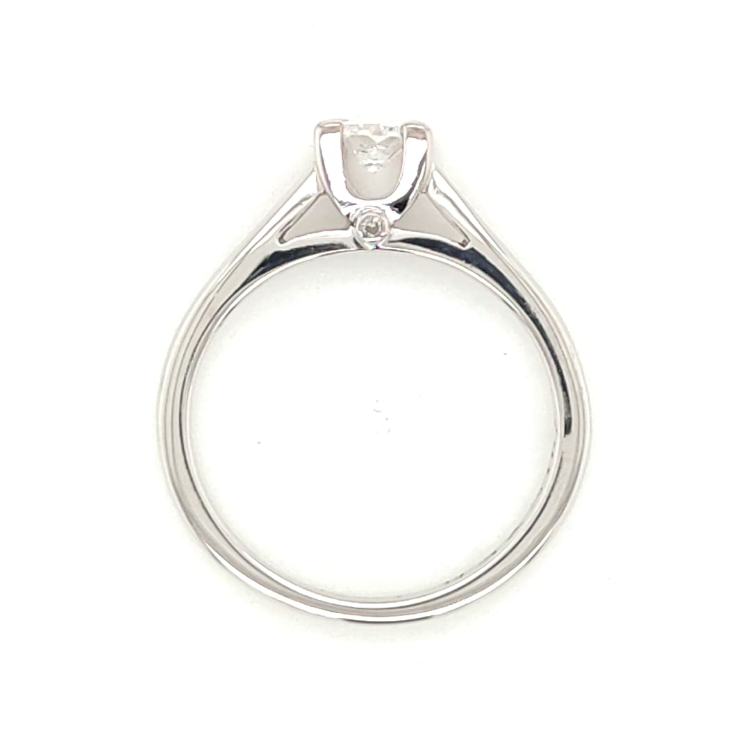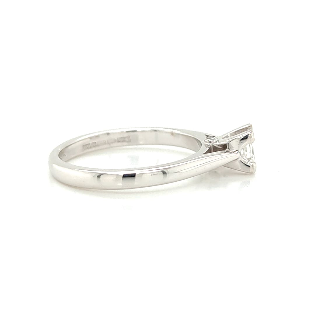 A white gold diamond engagement solitaire ring with a princess cut diamond in a four claw setting.