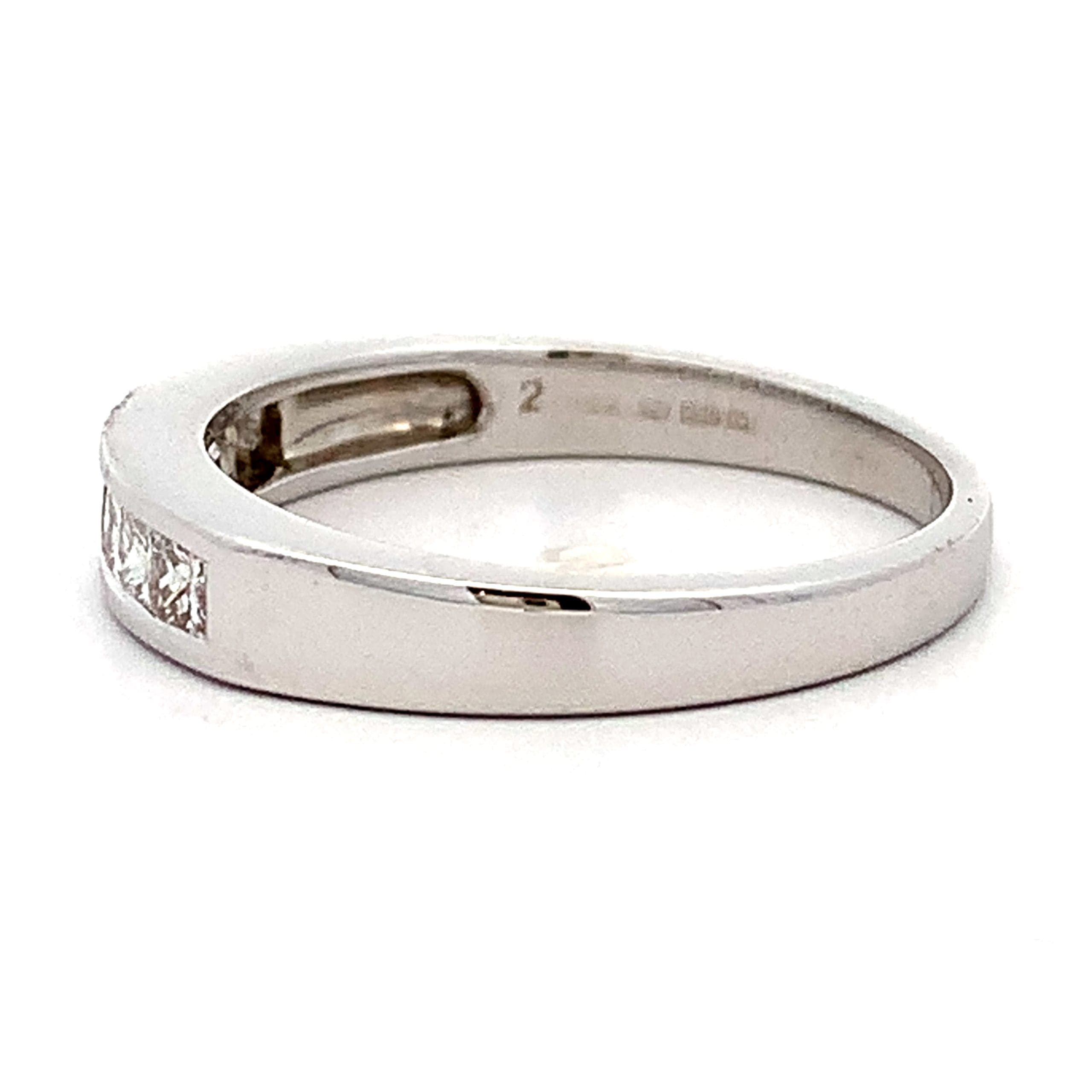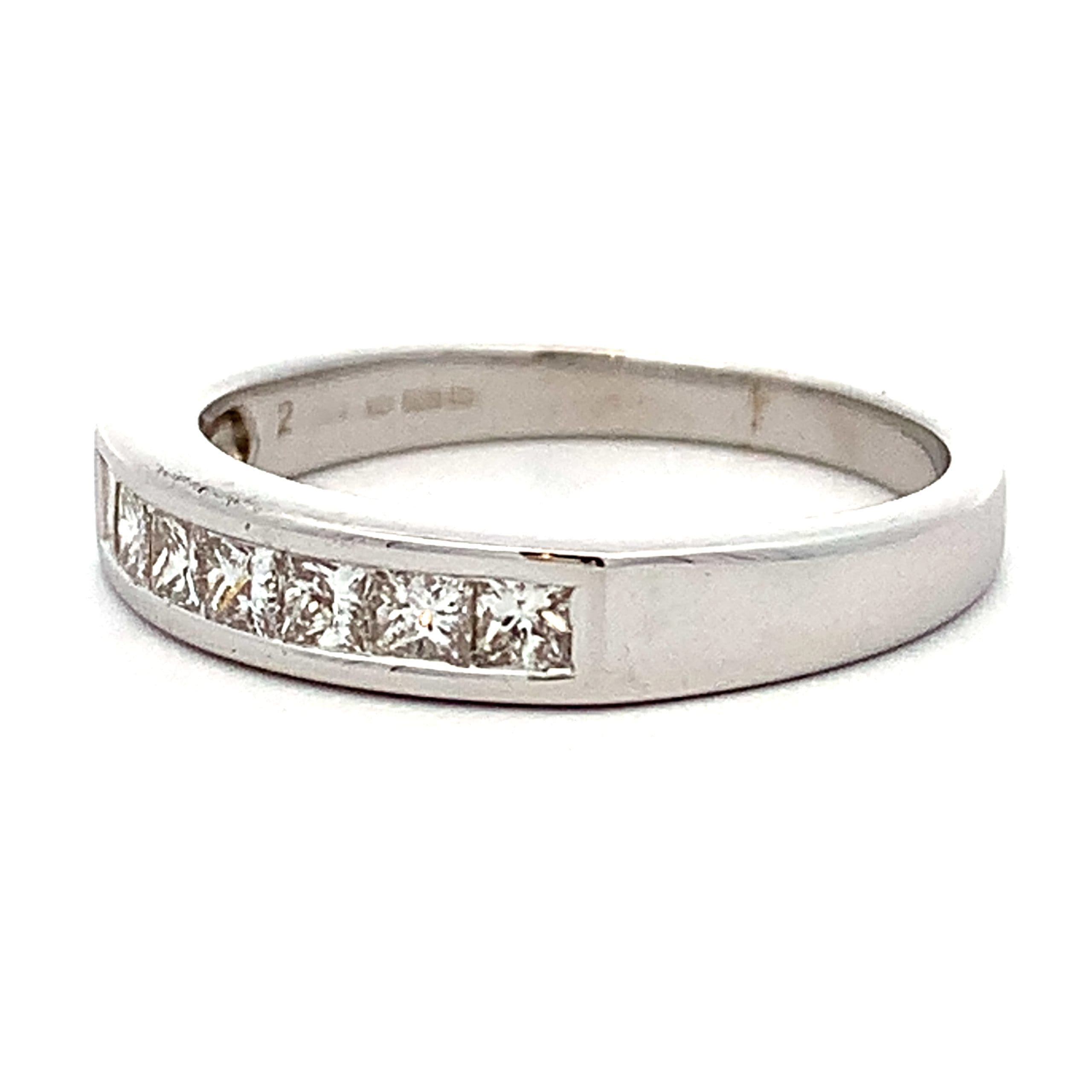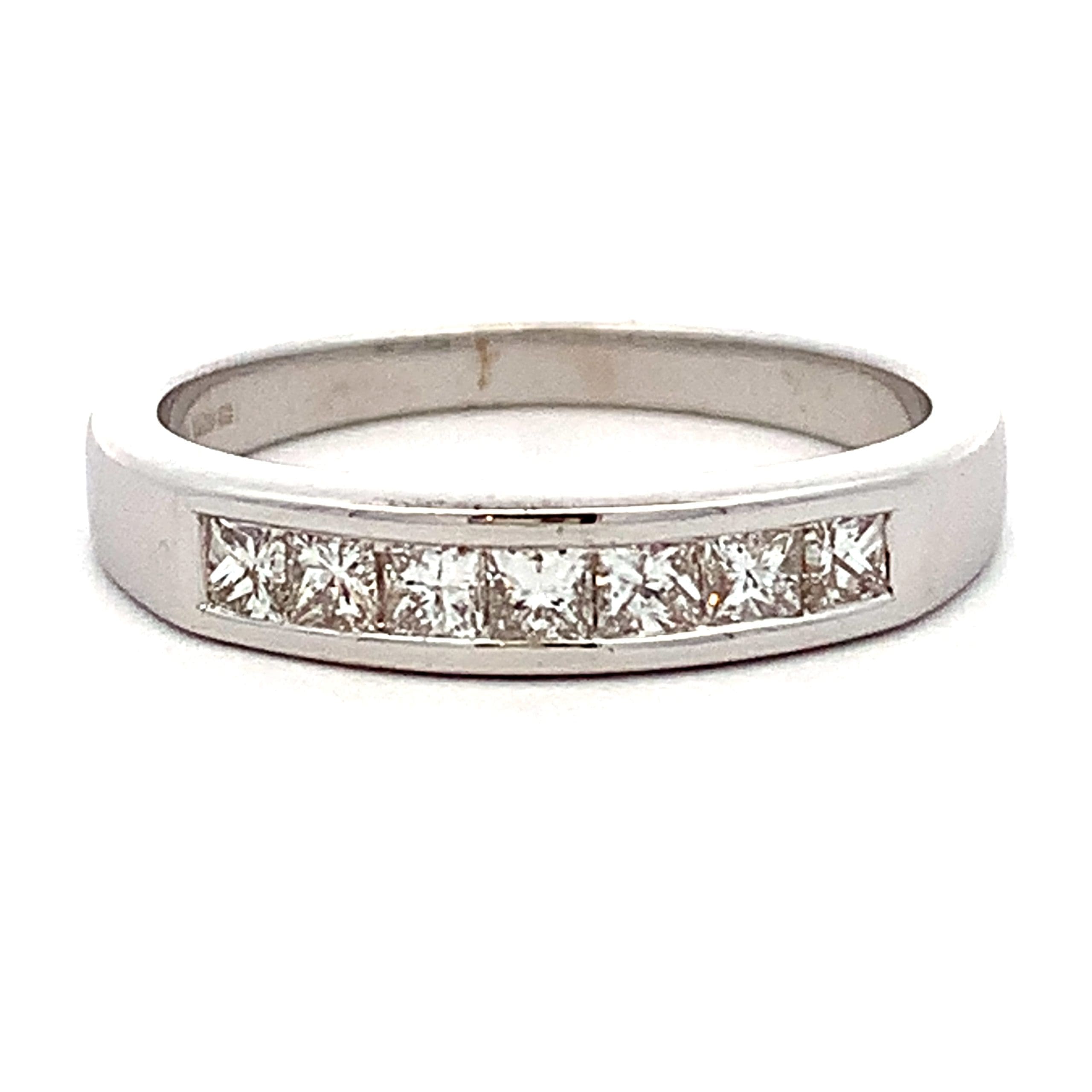 A strong band style ring channel set with princess cut diamond of good colour and clarity.
