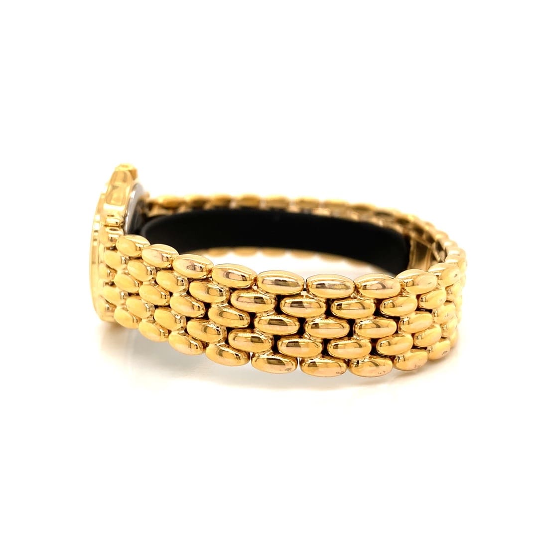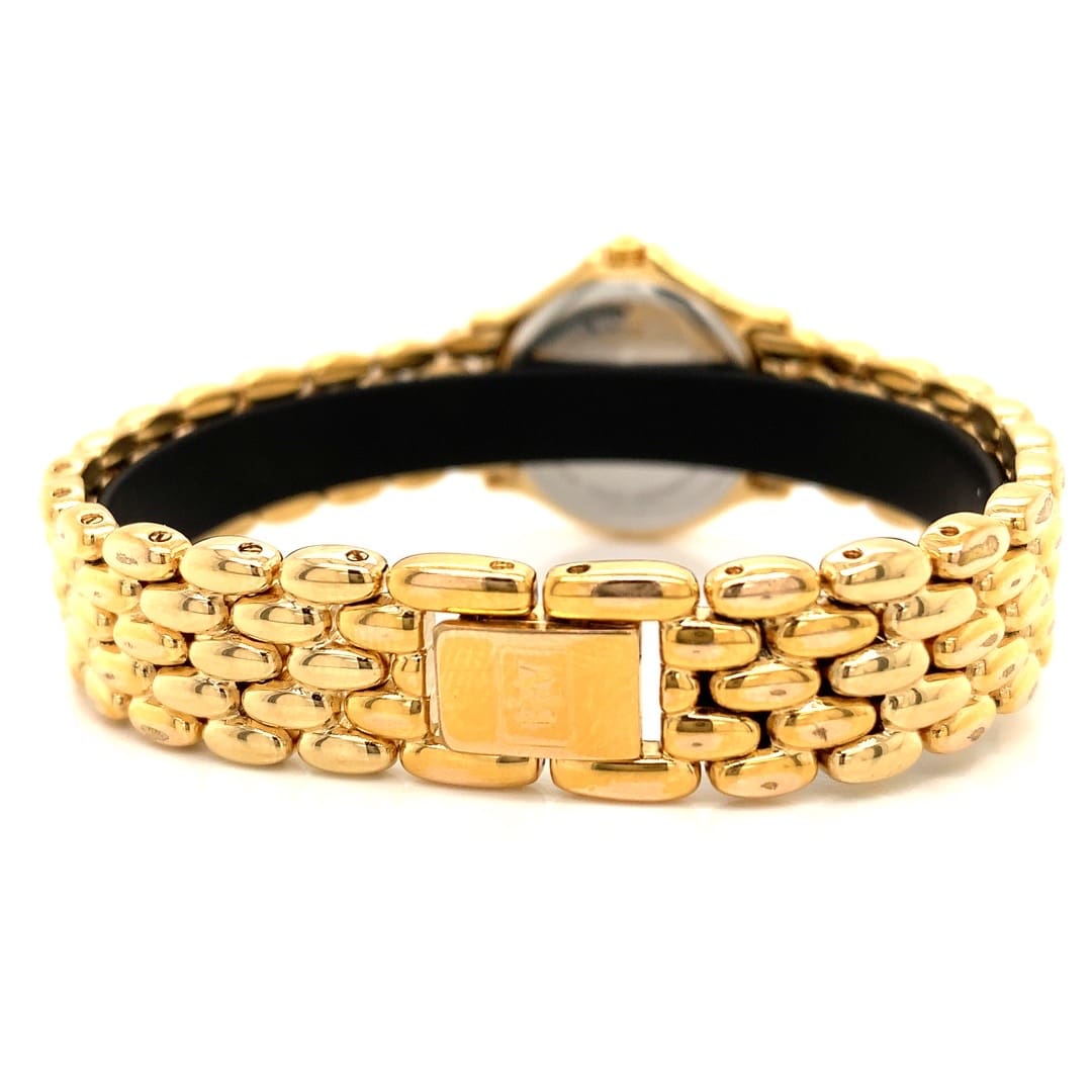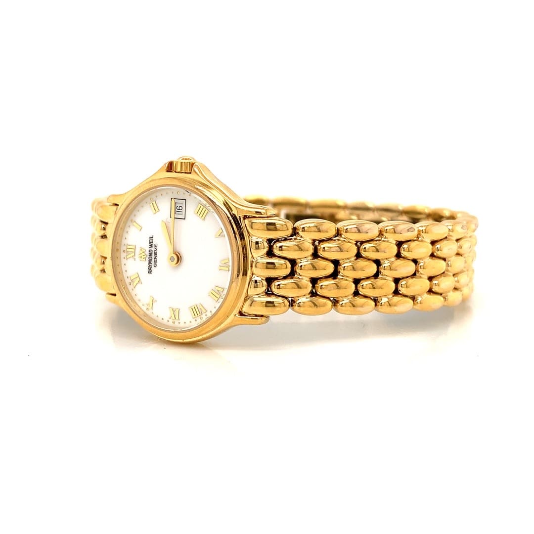 Swiss made Raymond Weil ladies gold plated Chorus watch with polished gold roman numerals and hands over a classic white dial . Adjustable bracelet with jewellery clasp.