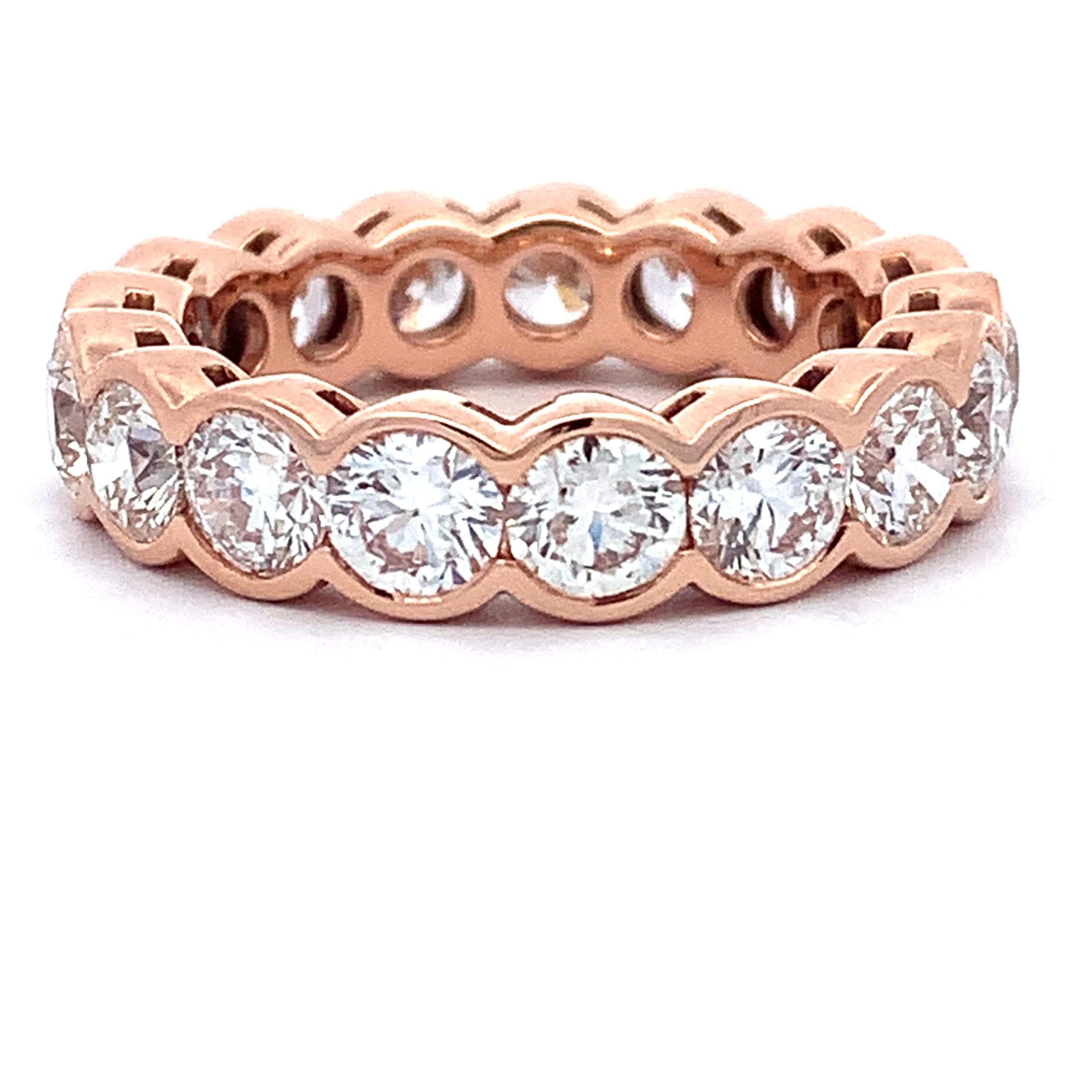 A bespoke ladies 18 carat rose gold, full eternity ring set with 17 round brilliant cut diamonds in a burnished setting.