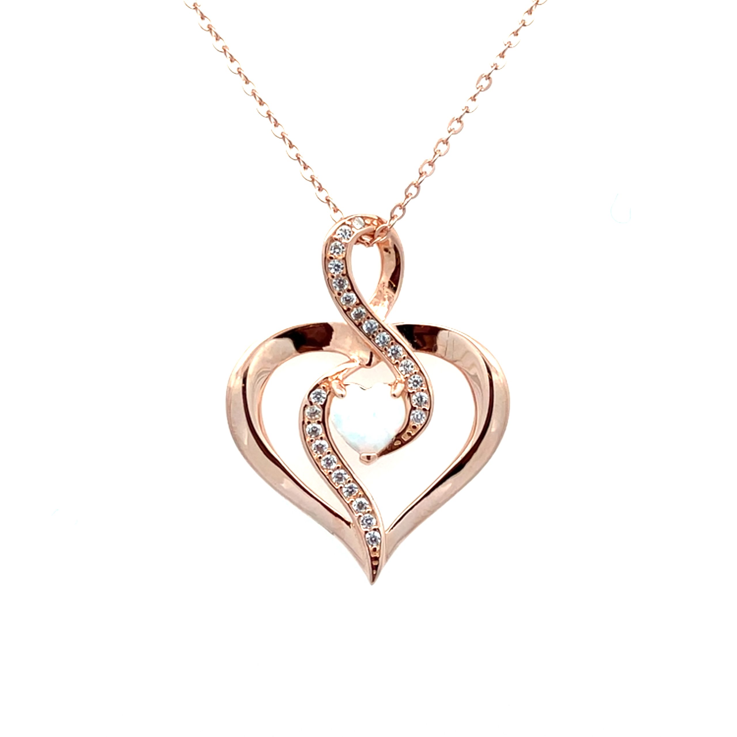 A lovely fluid form heart pendant set with created opal and cubic zirconia. With a sparkly trace chain.