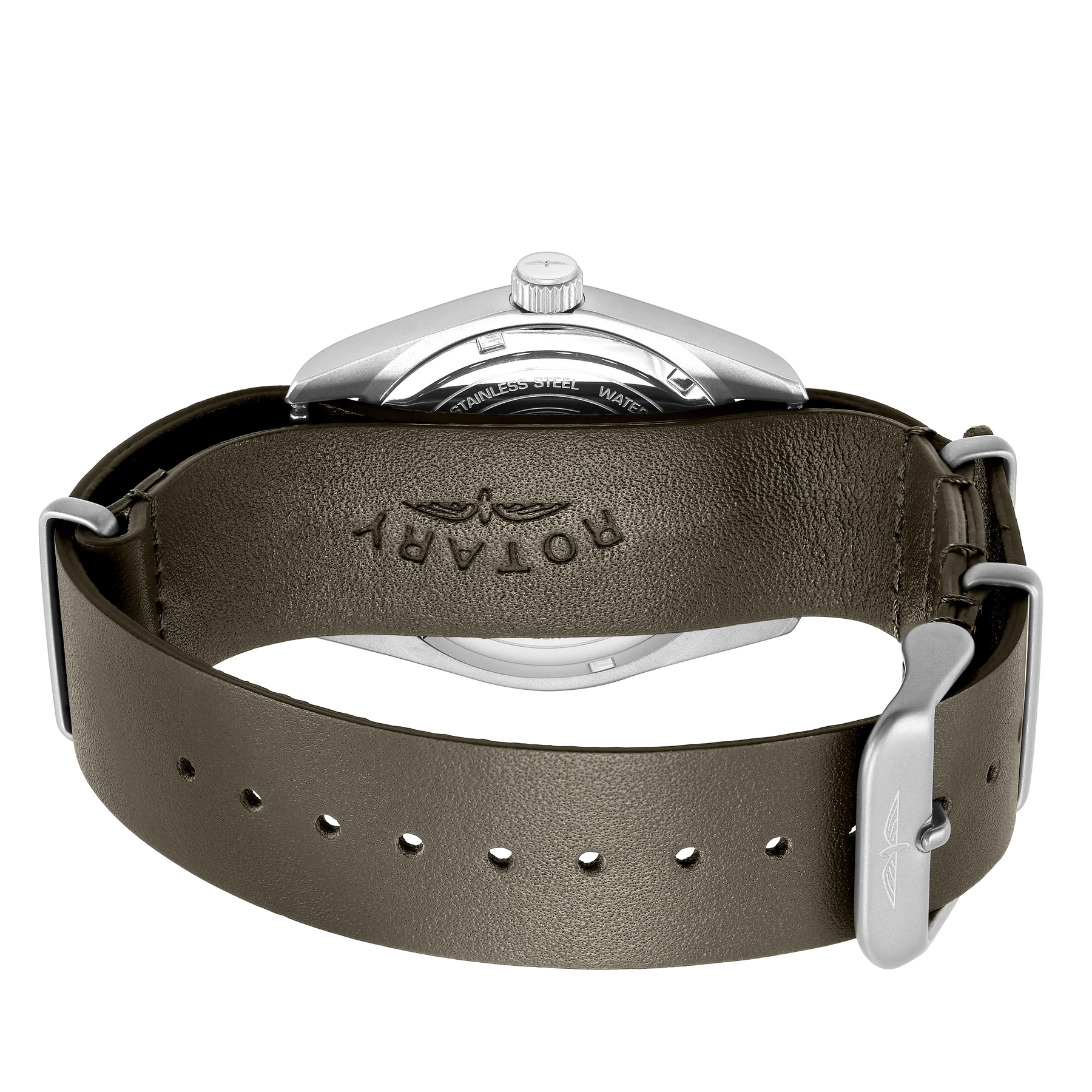 A highlight within the Rotary RW 1895 Field Watch line-up is the khaki leather NATO strap, combining practicality and comfort in a lightweight package, offering a fresh alternative to the 3-link bracelet. With a robust water resistance of 100m, the Rotary RW 1895 Field Watch thrives as the ideal adventure companion, ready to accompany you anywhere. The 37mm case size channels a vintage vibe, catering especially to those with smaller wrists.