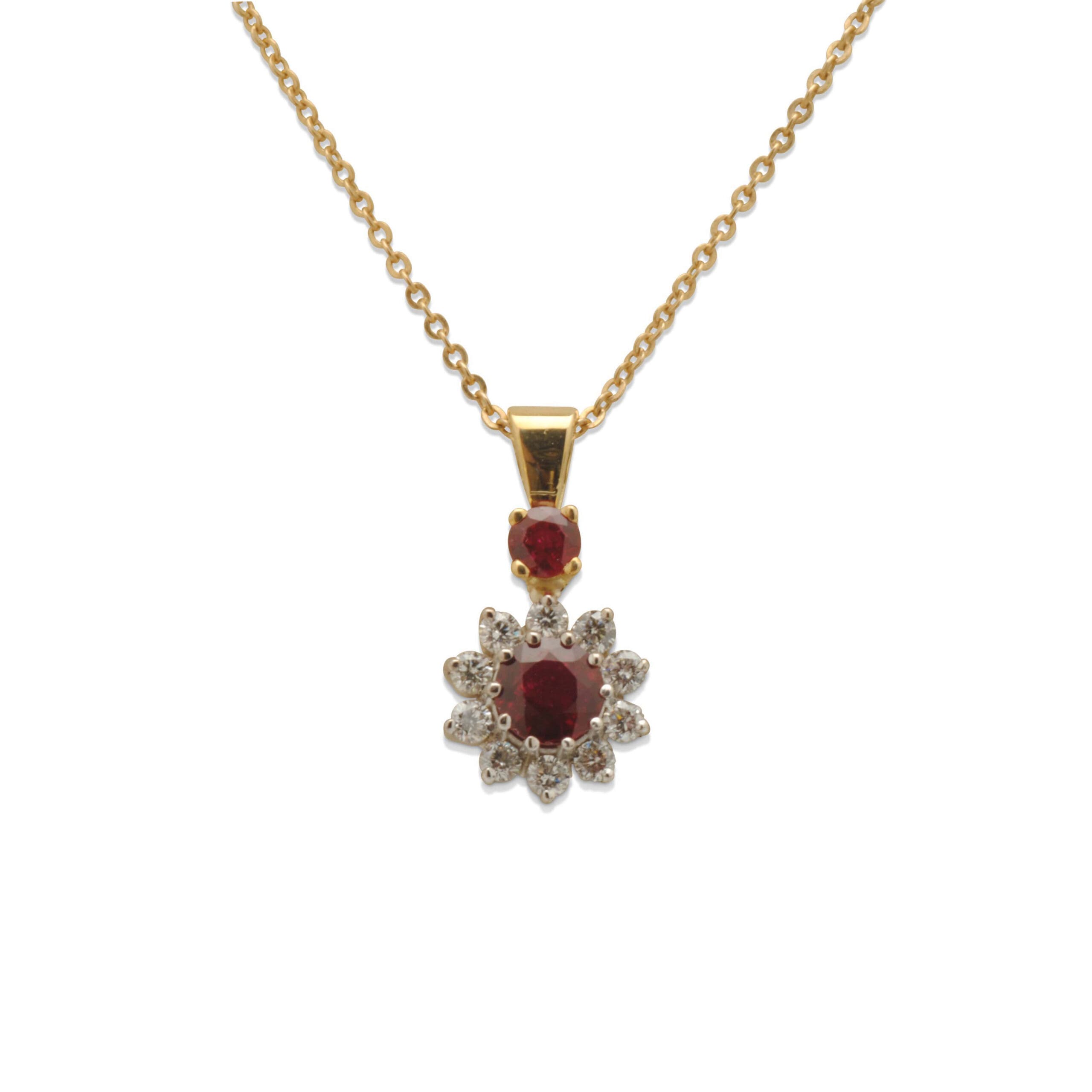 A handmade traditional 18 carat gold ruby and diamond pendant on a trace link chain. The round faceted natural ruby is of good colour and is claw set with ten brilliant cut diamonds. The bale is decorated with a single round ruby.