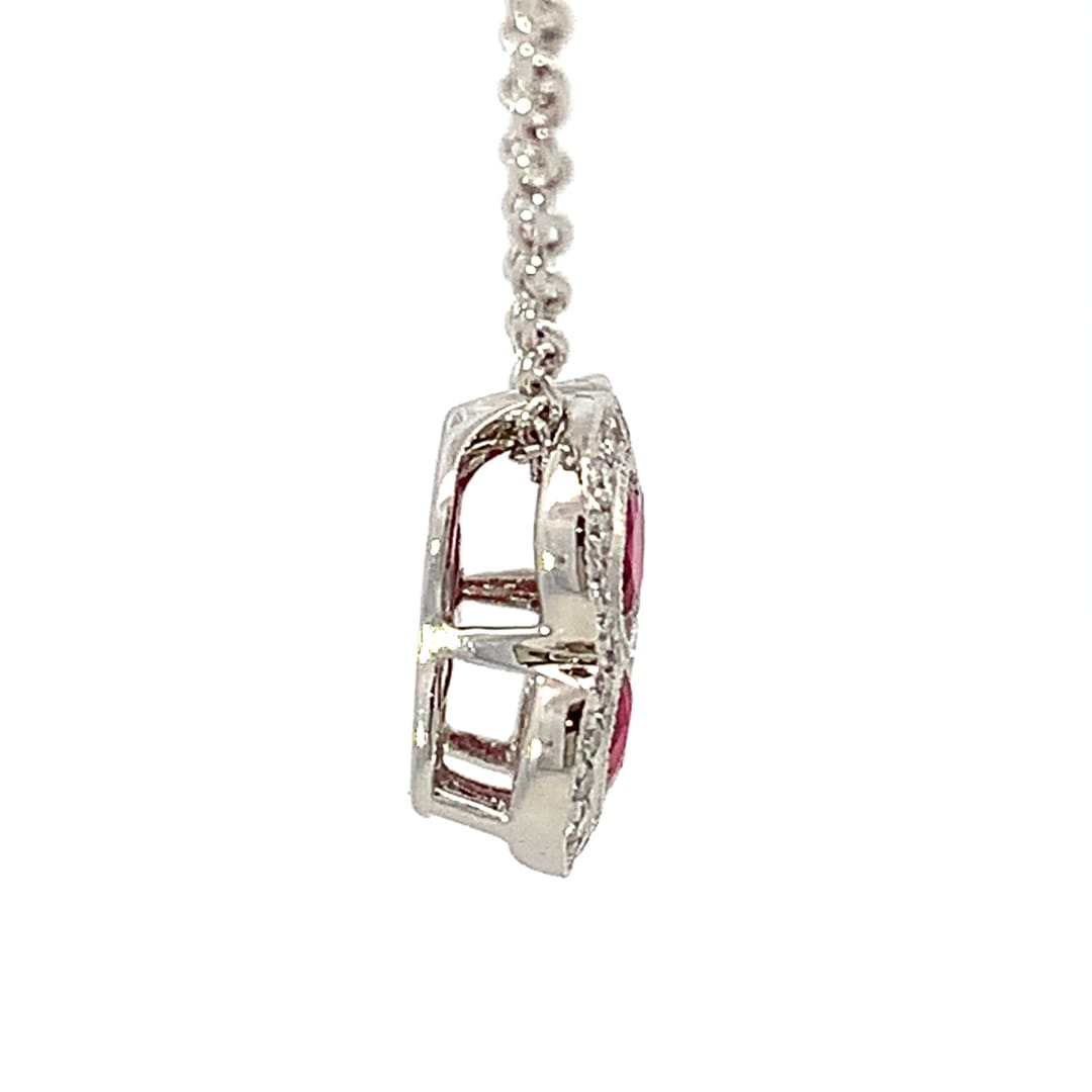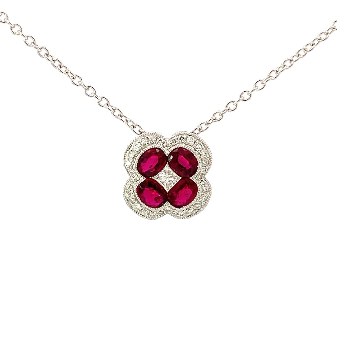 A smooth quatrefoil shape pendant set with rich oval cut Ruby framed by a pretty diamond pave frame and a central princess cut diamond. With an adjustable trace link chain.
