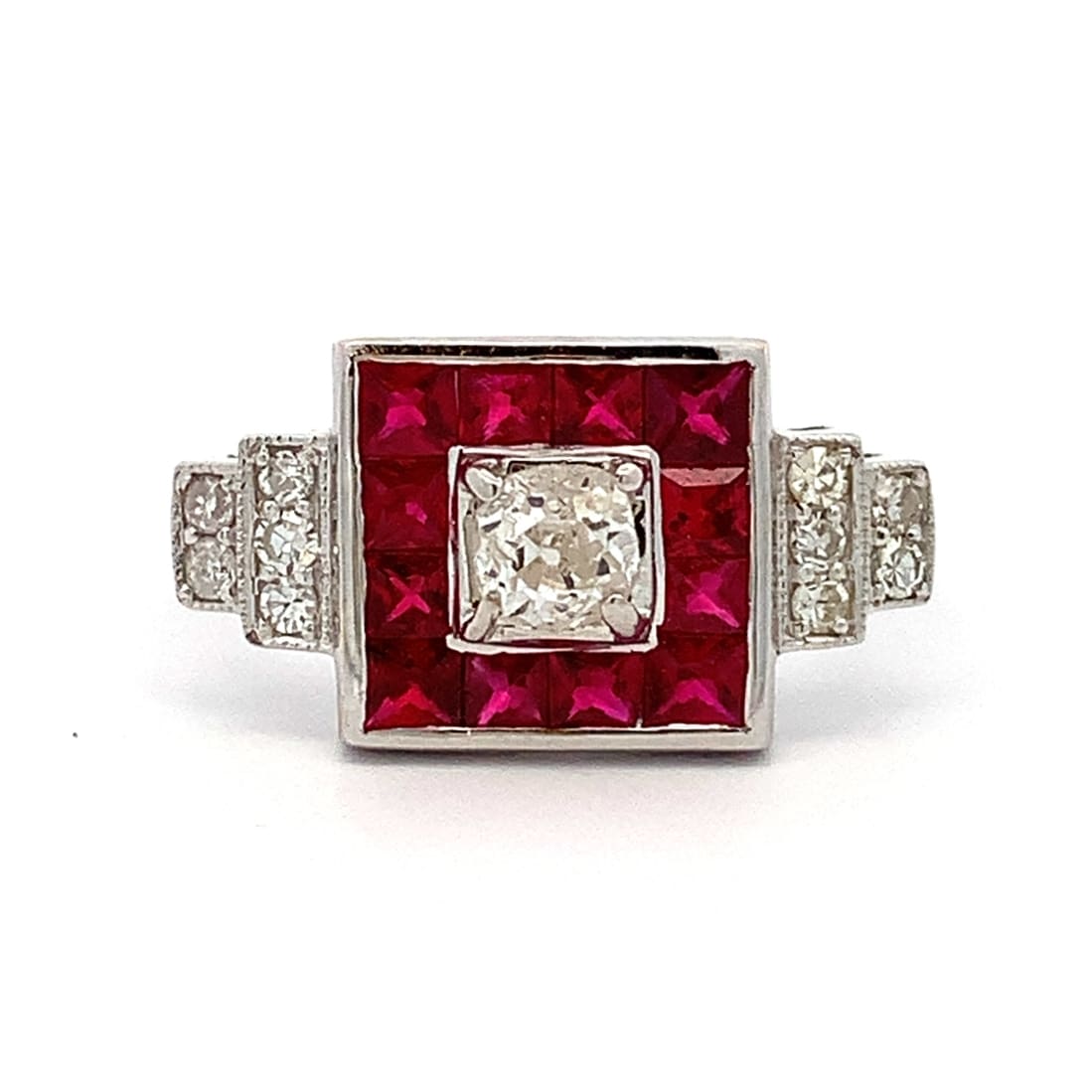 A striking Deco style White Gold ring with calibre cut, channel set Rubies surrounding a central, old cut Diamond.