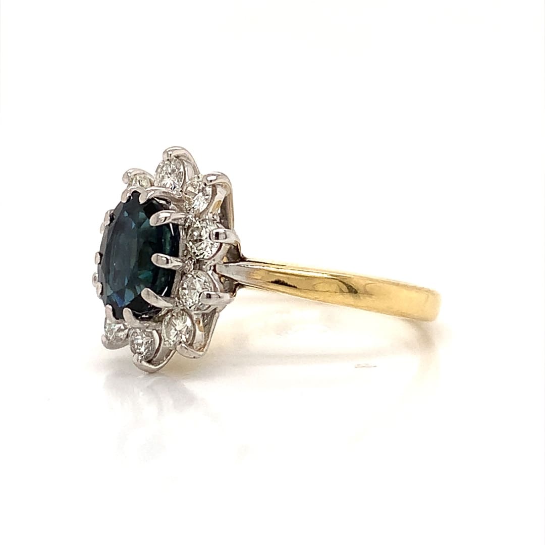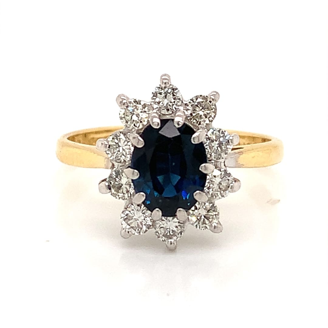 A beautiful cluster ring claw set with an oval deep blue sapphire framed by ten bright brilliant cut diamonds. Made with a white gold setting and yellow gold ring shank.