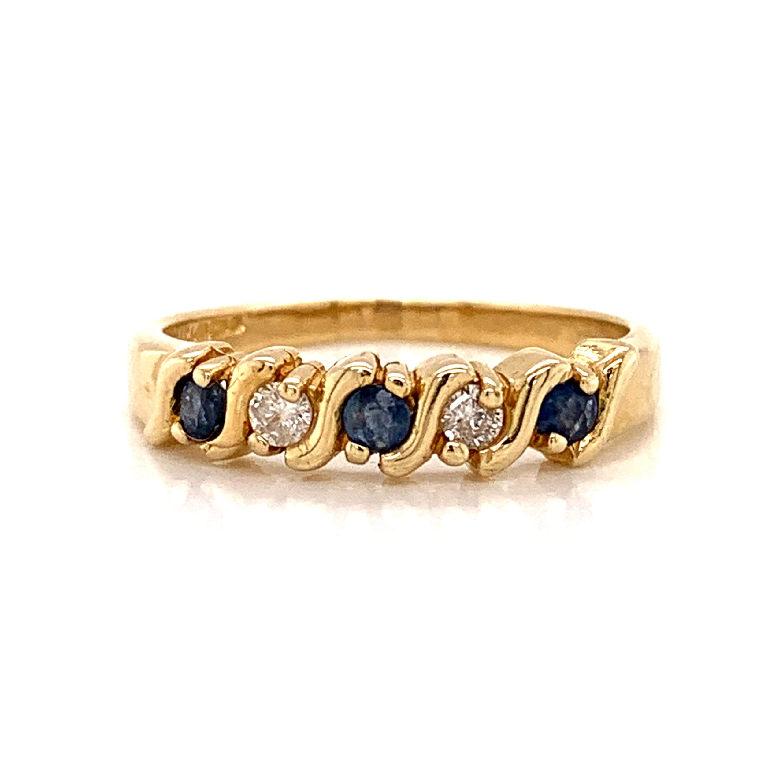 This ring has a wave design setting with round cut blue sapphires and diamonds.