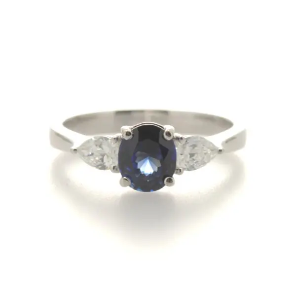 A beautifully vibrant oval sapphire, claw set between bright pear cut diamonds.