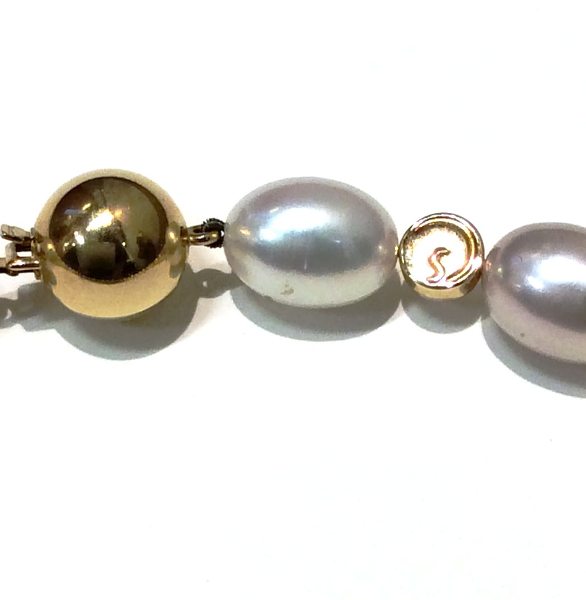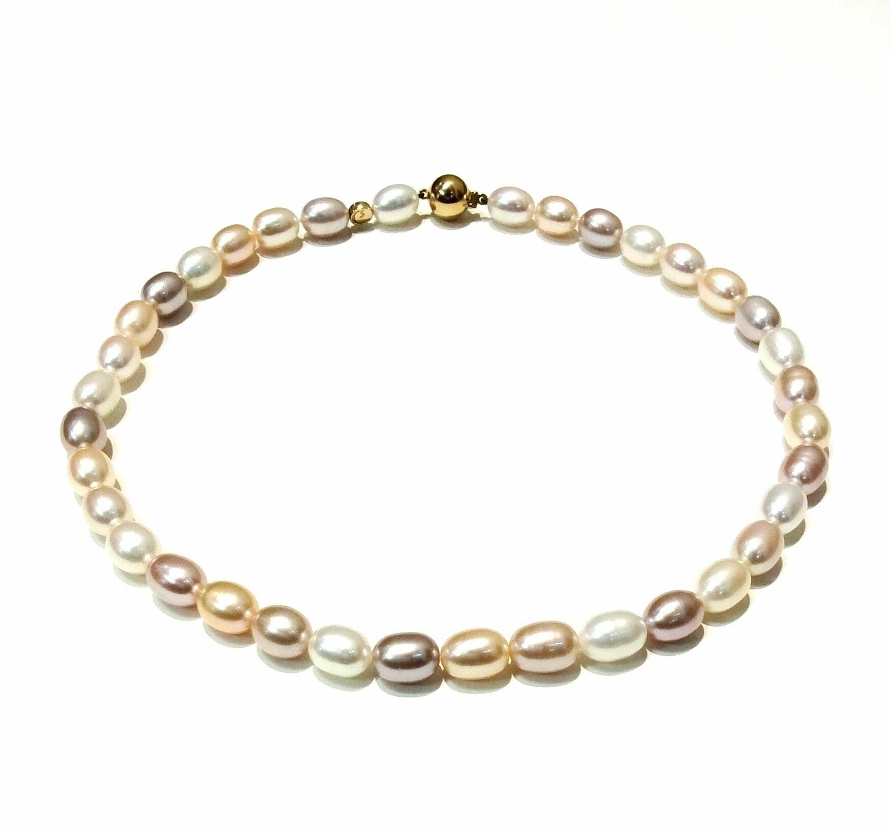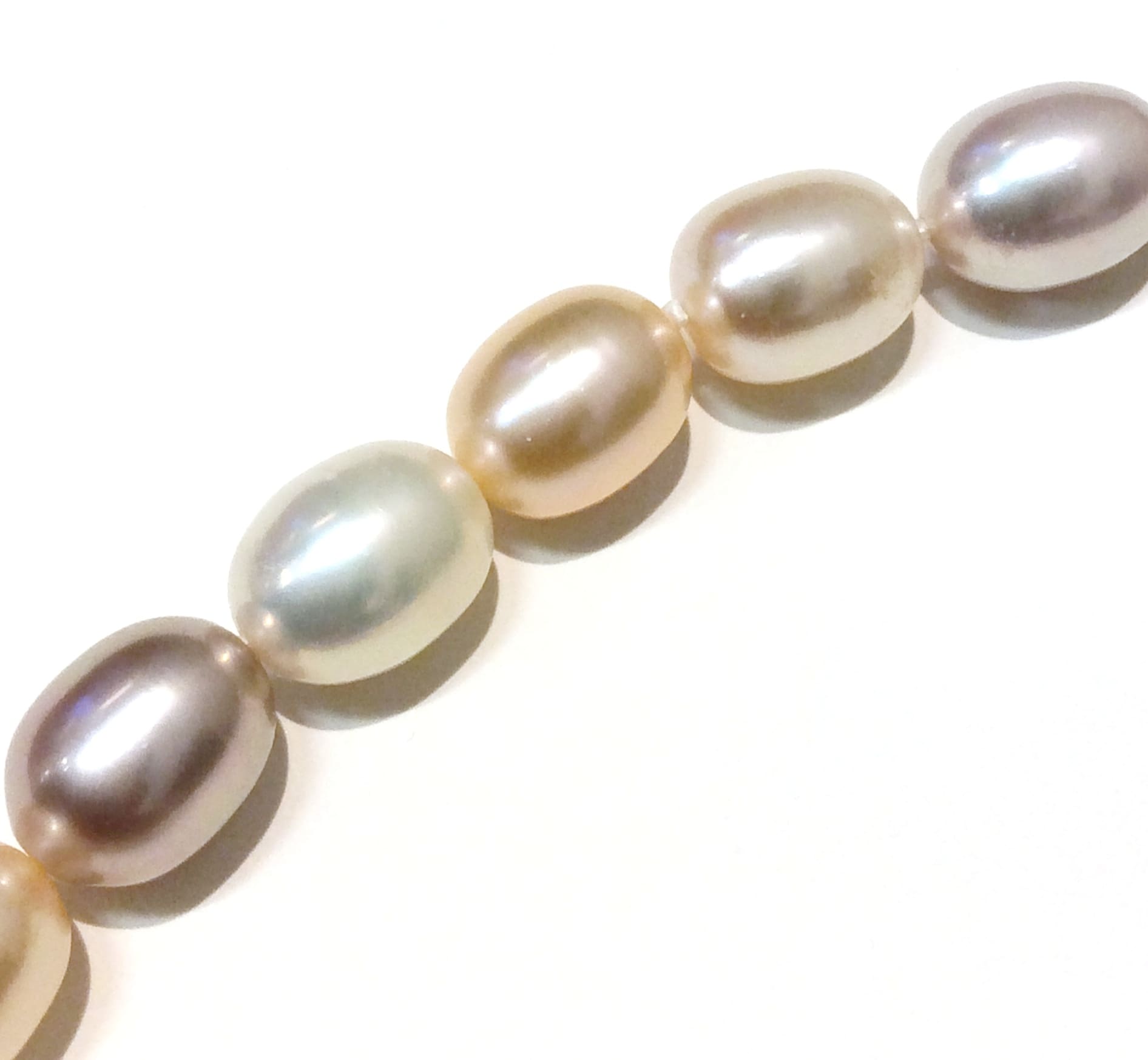 Gorgeous excellent lustre oval pearls in soft hues of purple white and peach strung without knots on an 18ct gold clasp and Schoeffel signature bead.