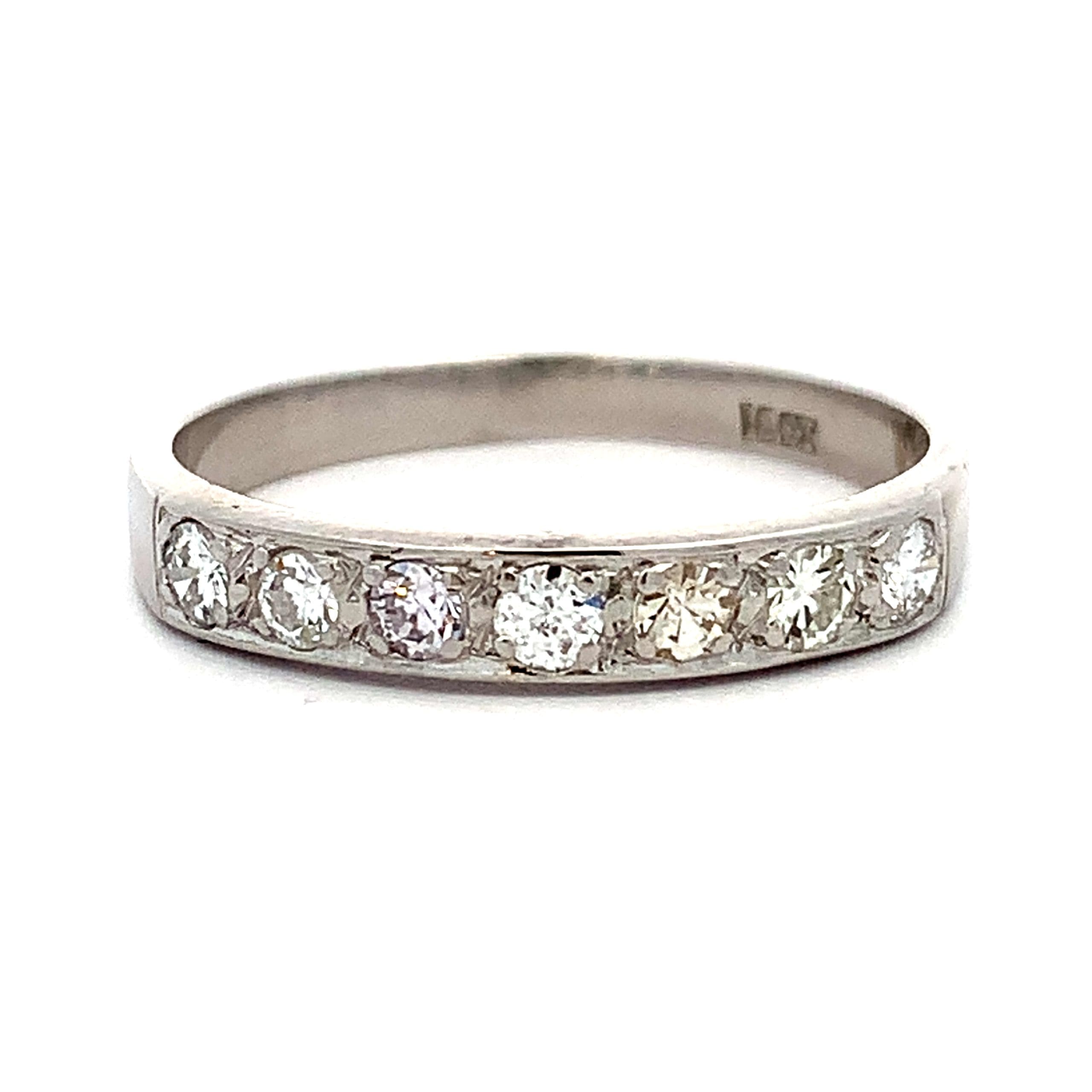 A bright and beautiful diamond eternity ring in white gold and platinum, grain set with seven round brilliant cut diamonds. With good colour and clarity diamonds.