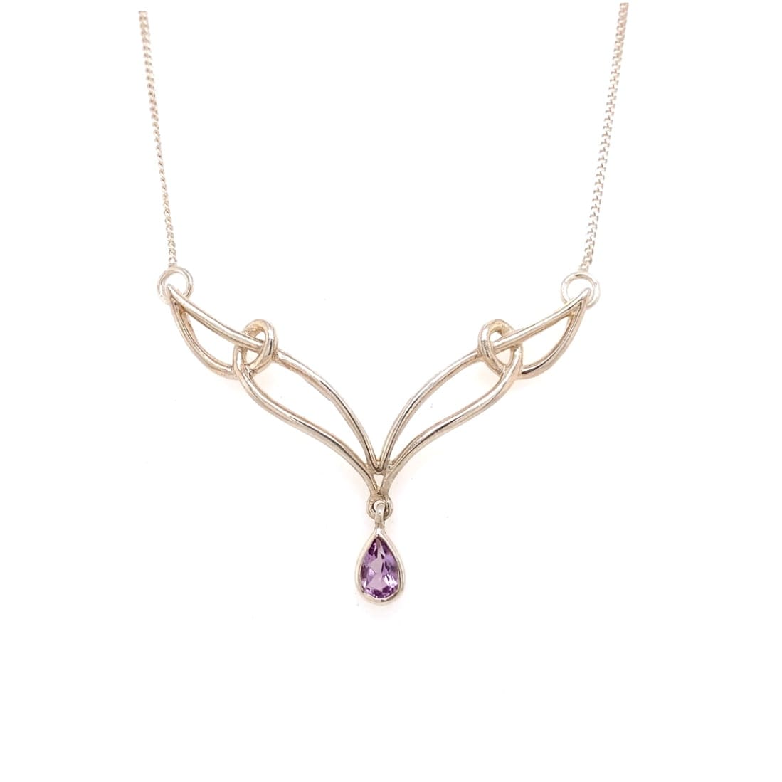 An attractive wishbone style pendant with a pear shape drop Amethyst.