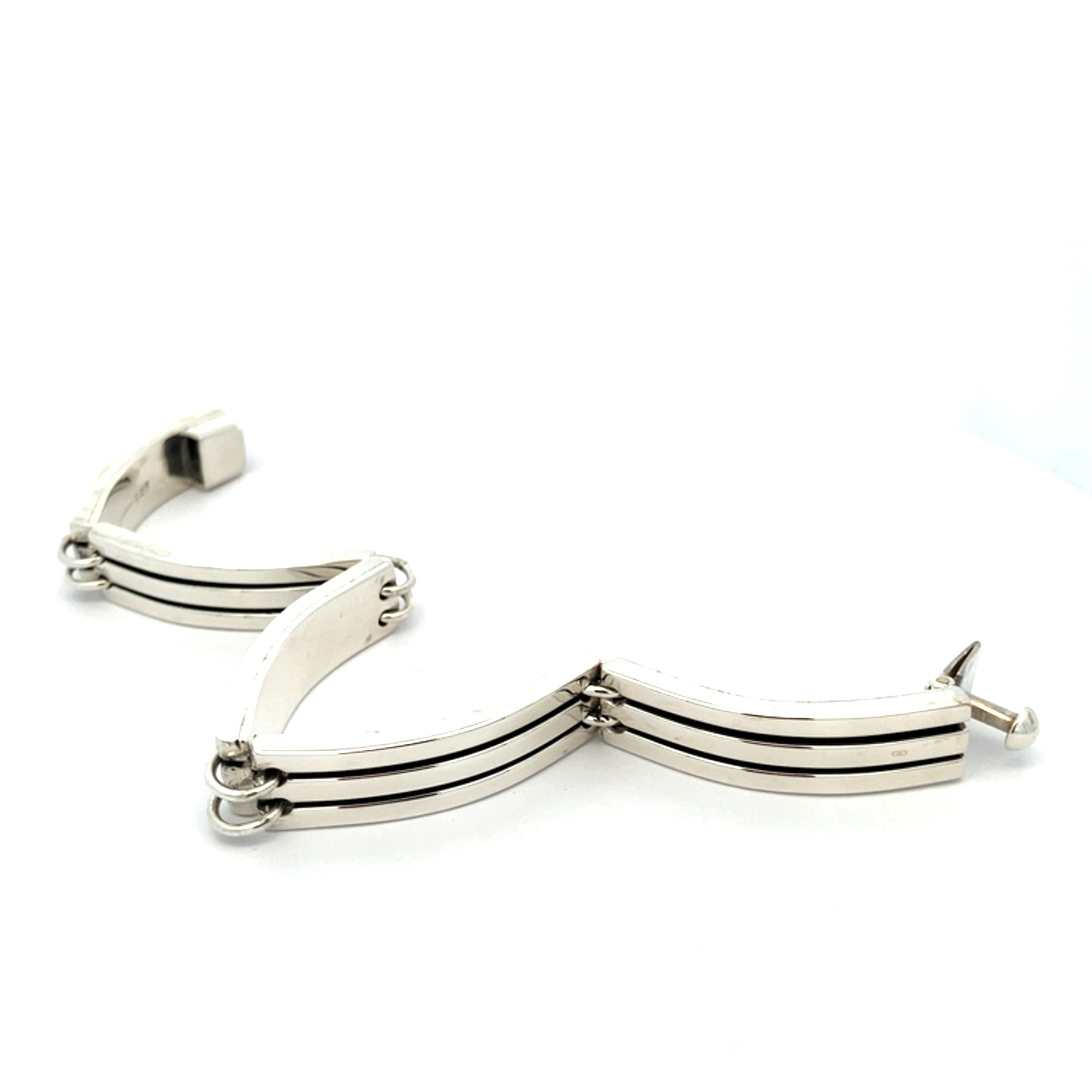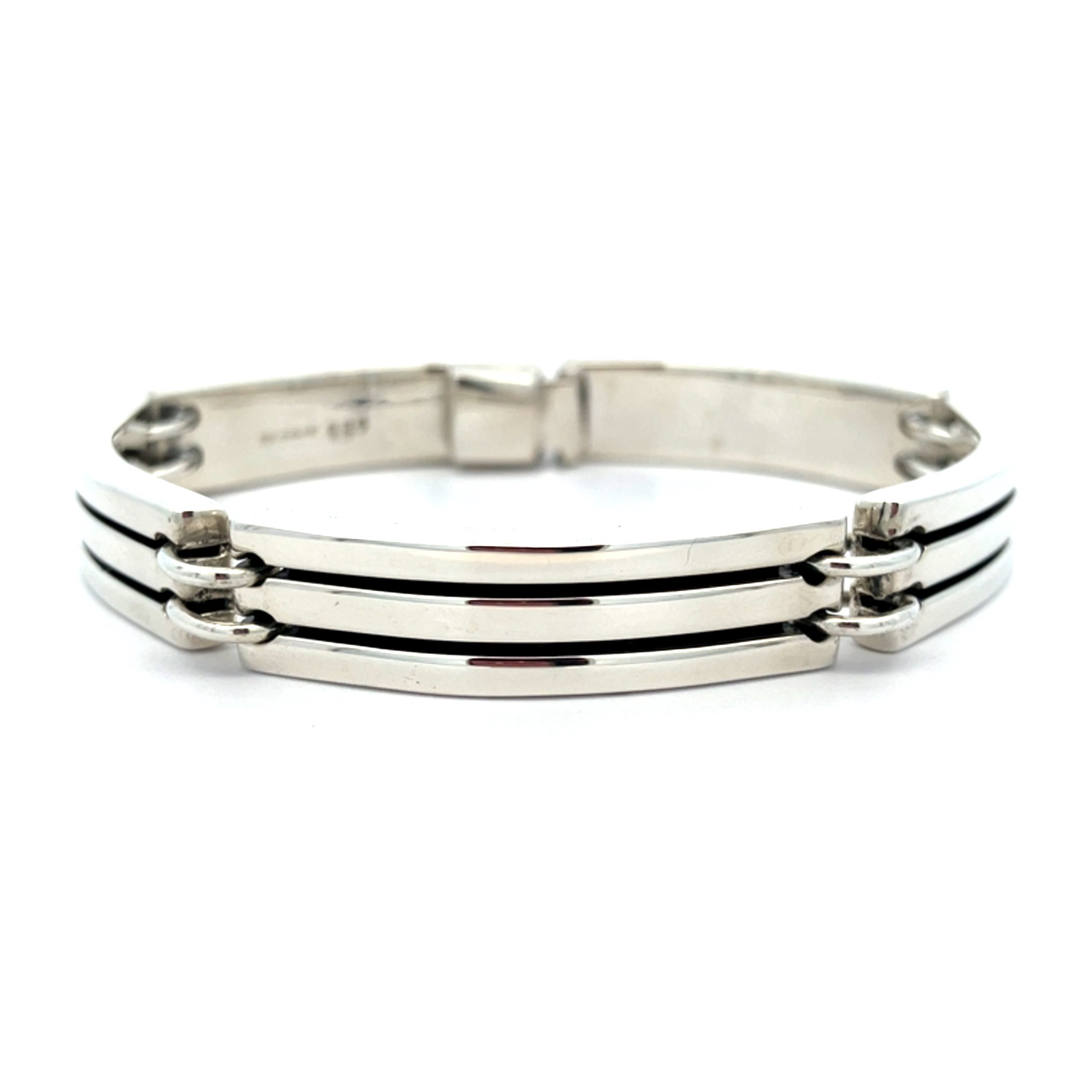 A heavy-weight bracelet with chunky linear detailed sections. With a box clasp.