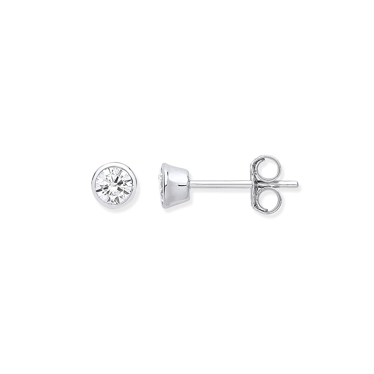 A pair of rub-over set cubic zirconia stud earrings in sterling silver with scroll back fittings.
