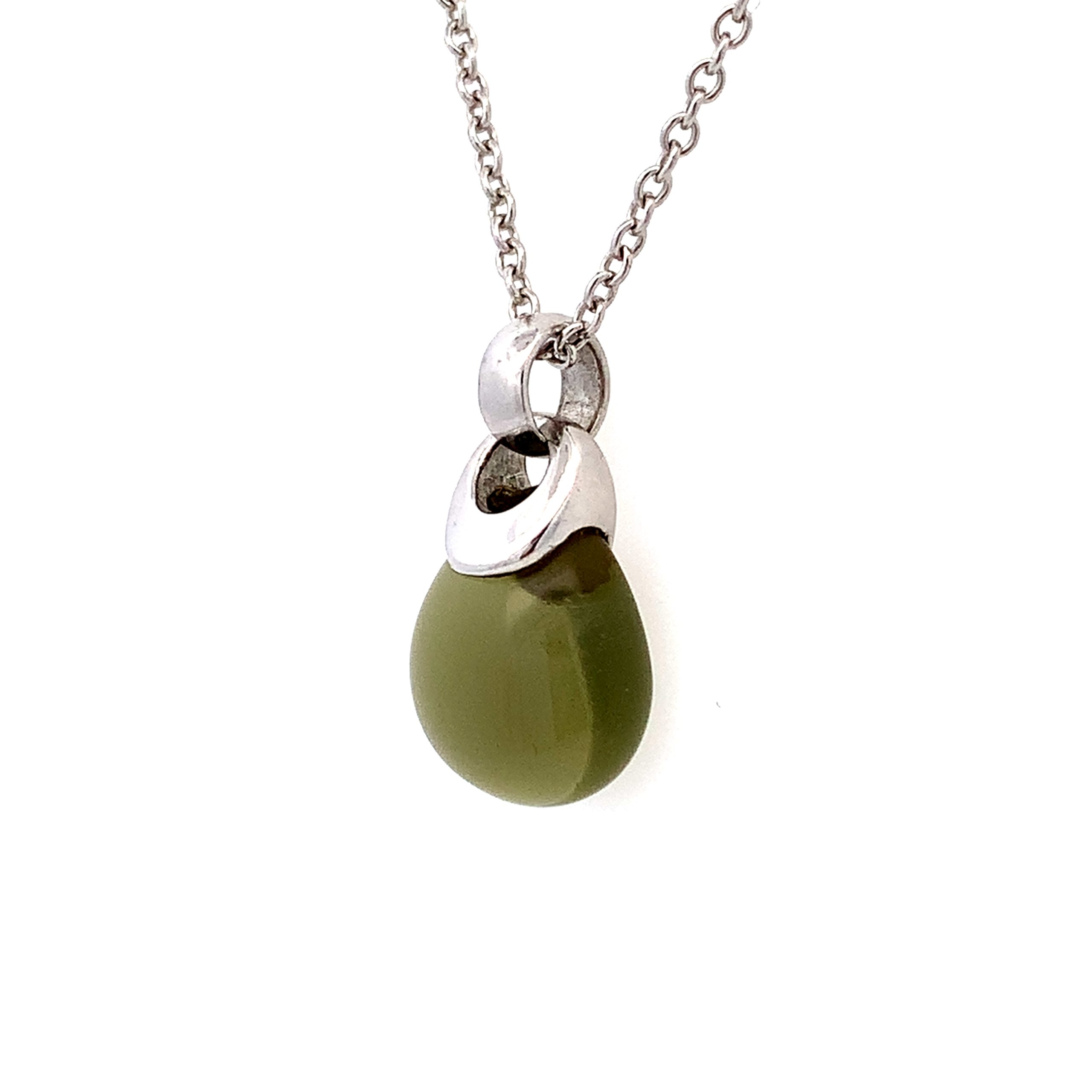 A sweet sterling silver necklace comprising a polished quartz pebble pendant on a trace link chain.