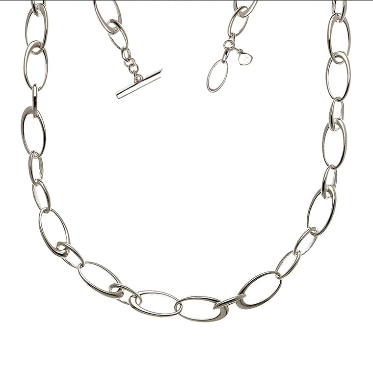 Smooth organic form oval links in sterling silver with a ring and bar fastening.