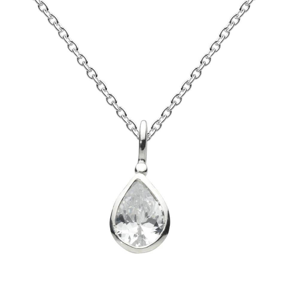 Sparkling pear cut cubic zirconia rub-over set in a smooth pendant on an 18 inch trace link chain.