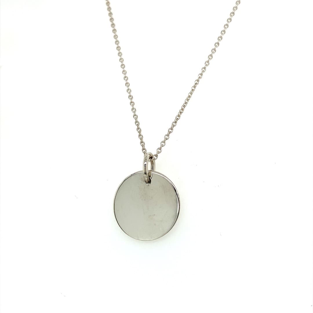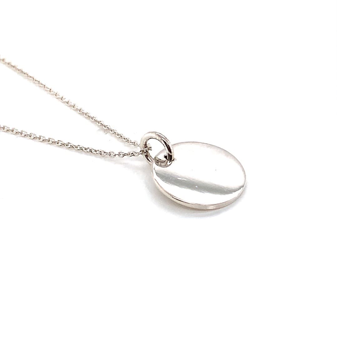 A simple silver disc and chain. Ideal for engraving.