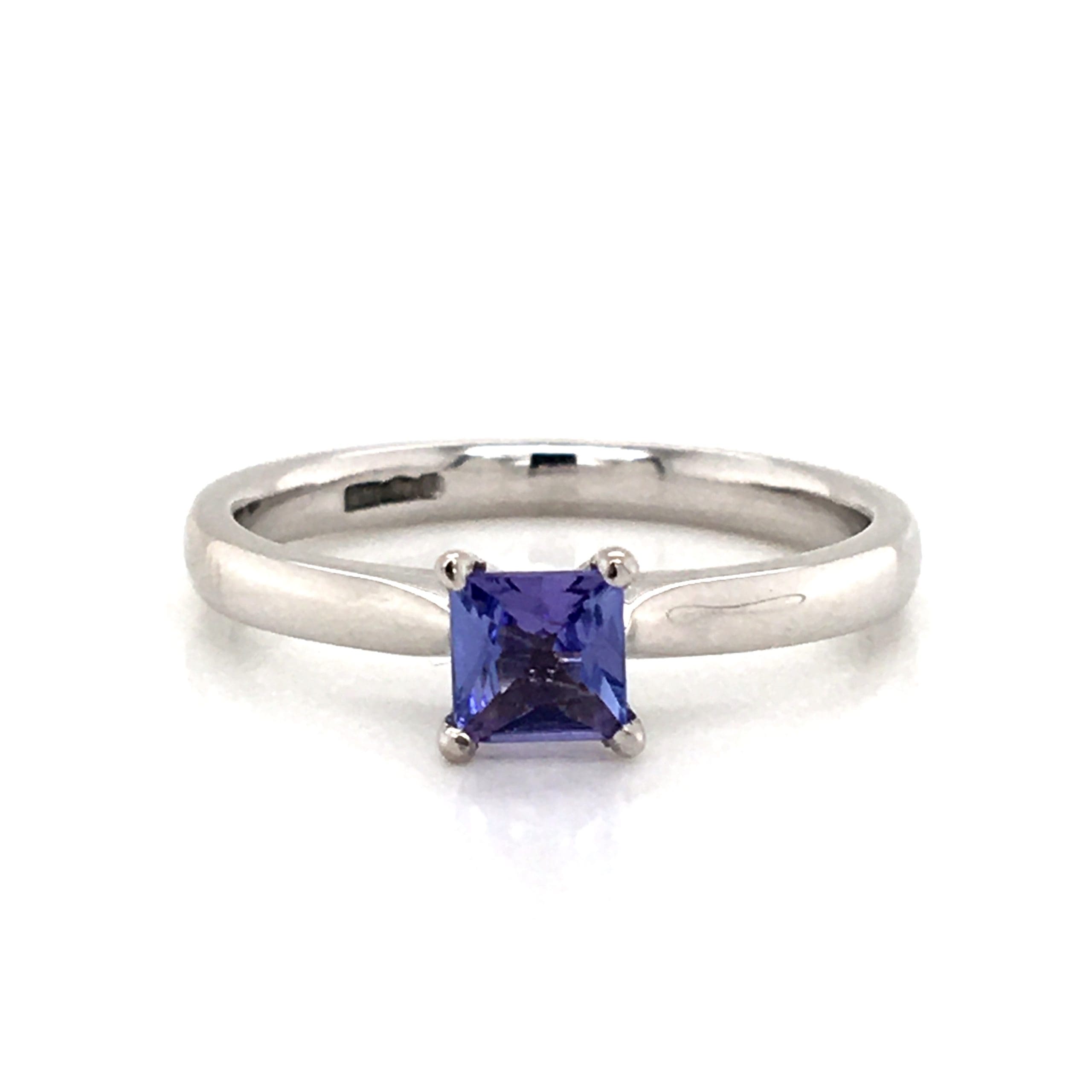 A platinum solitaire ring with a square cut tanzanite in a four claw setting.