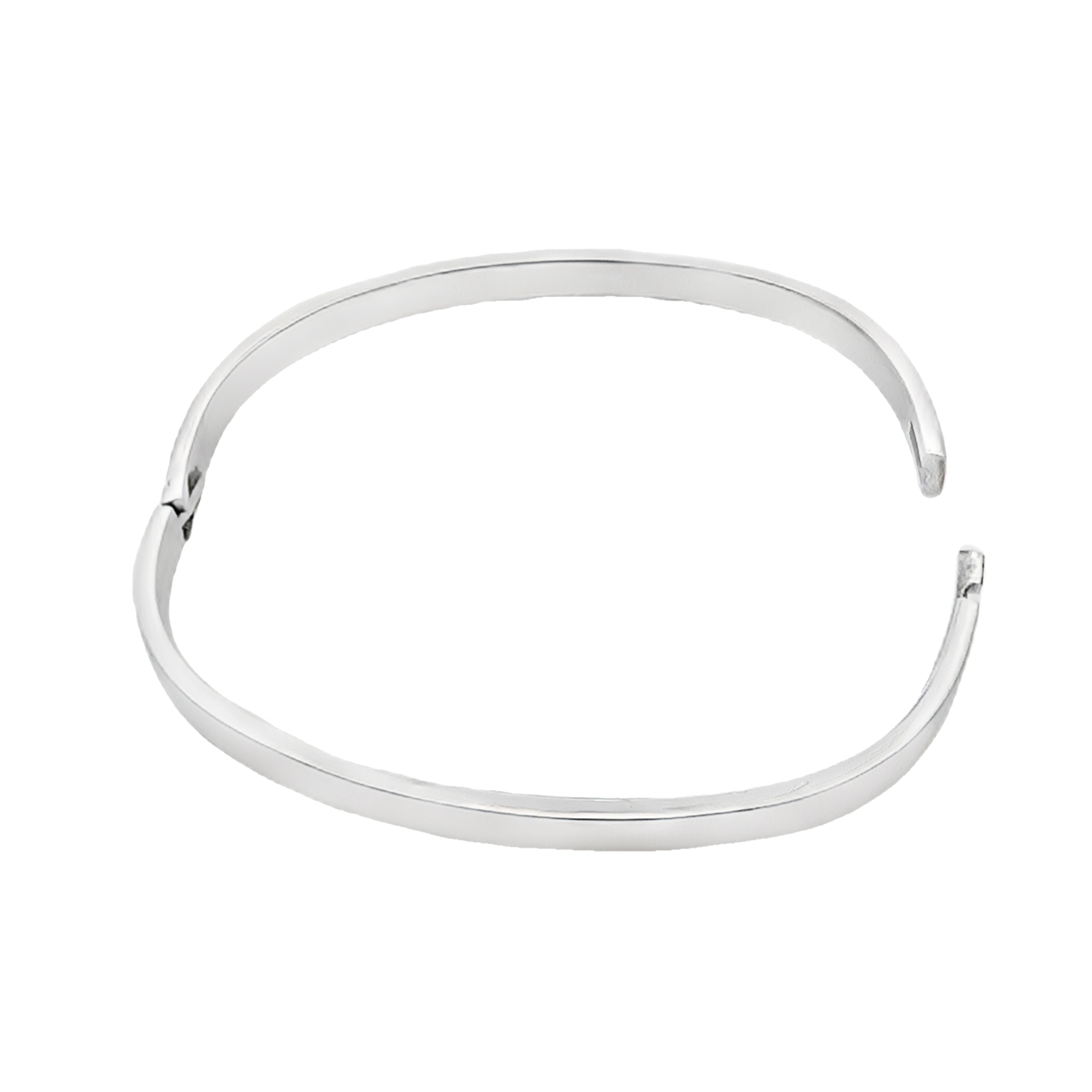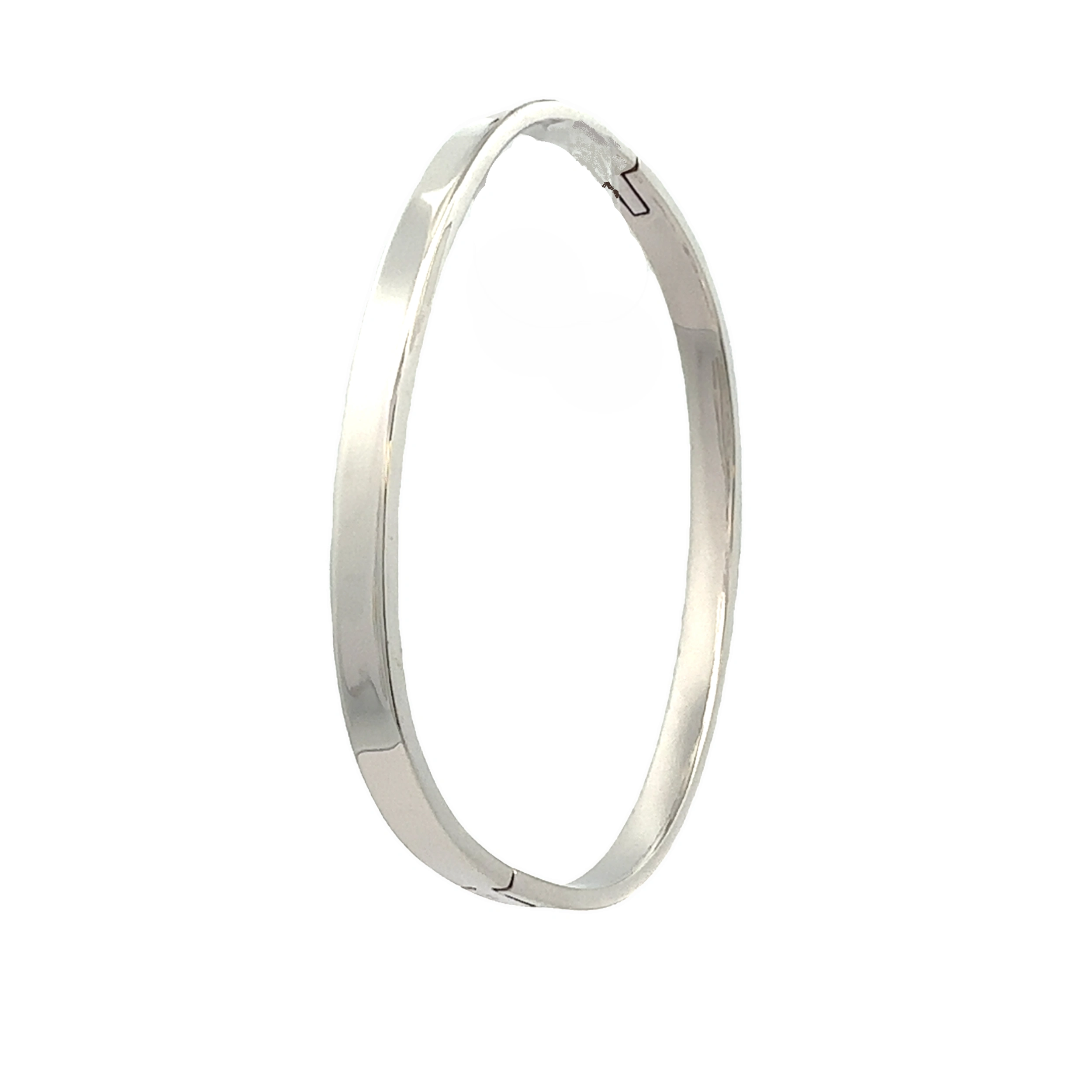 A solid silver flat sided hinged bangle with a lift catch opening.