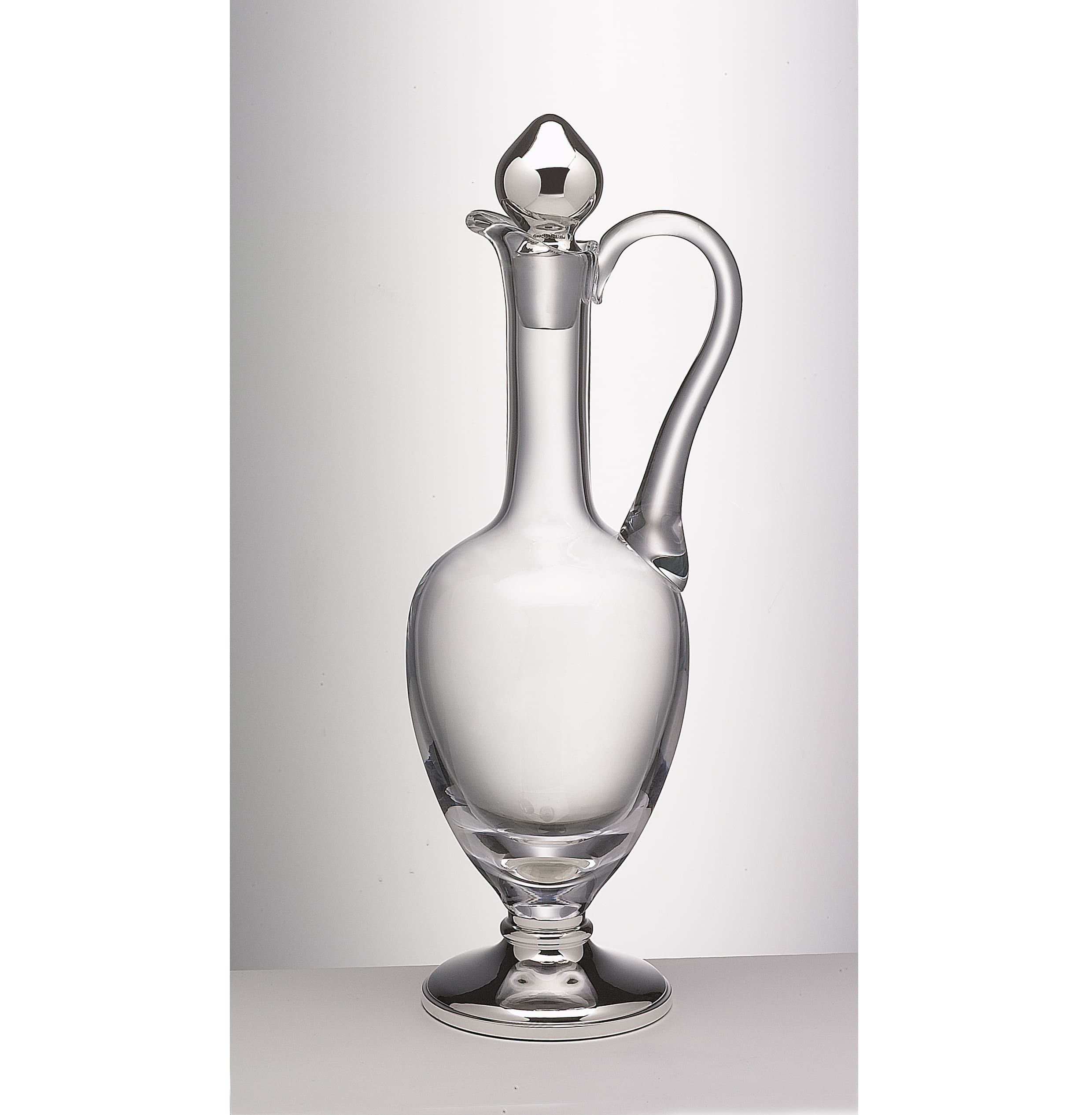 A tall hand blown glass claret jug with a silver and glass stopper and silver foot.
