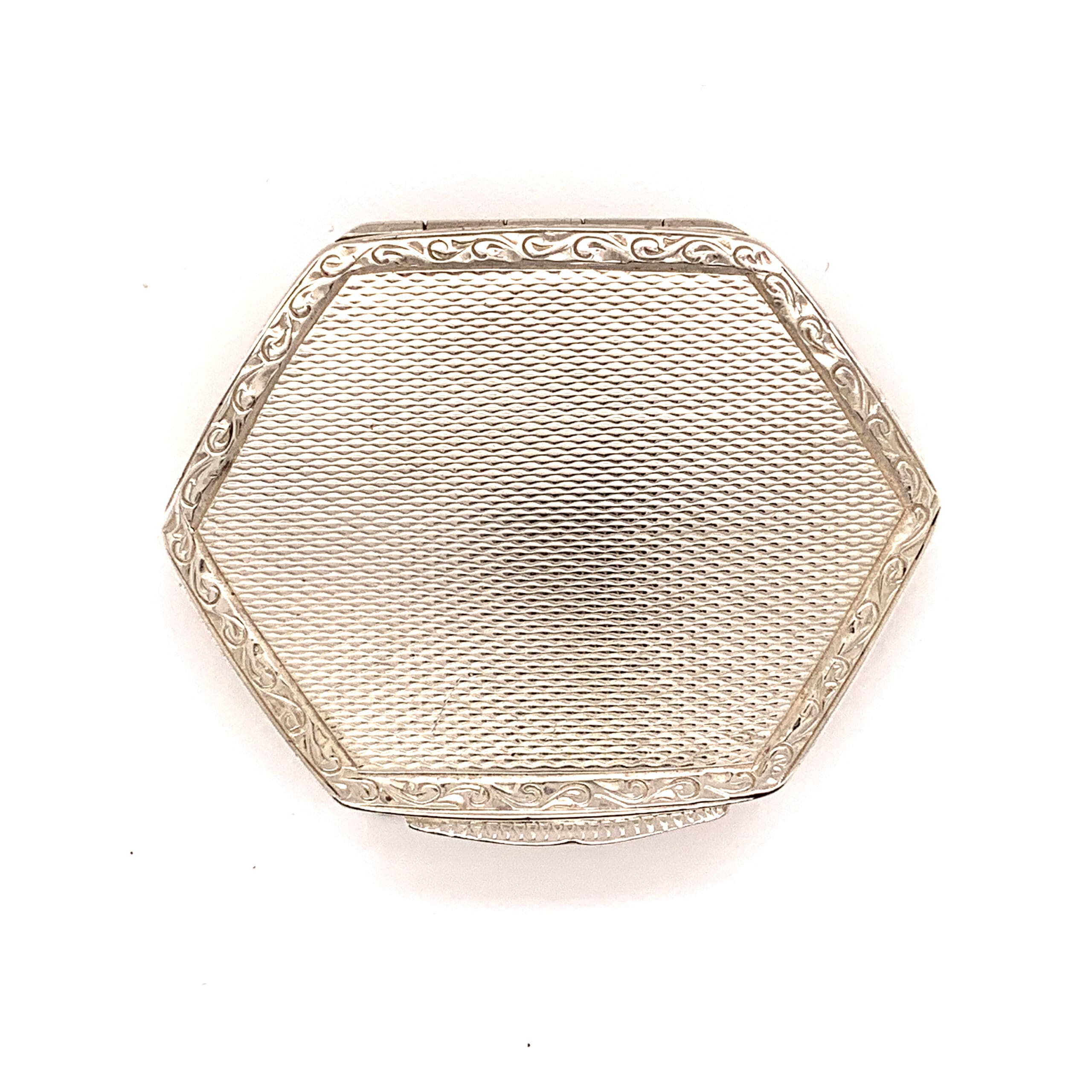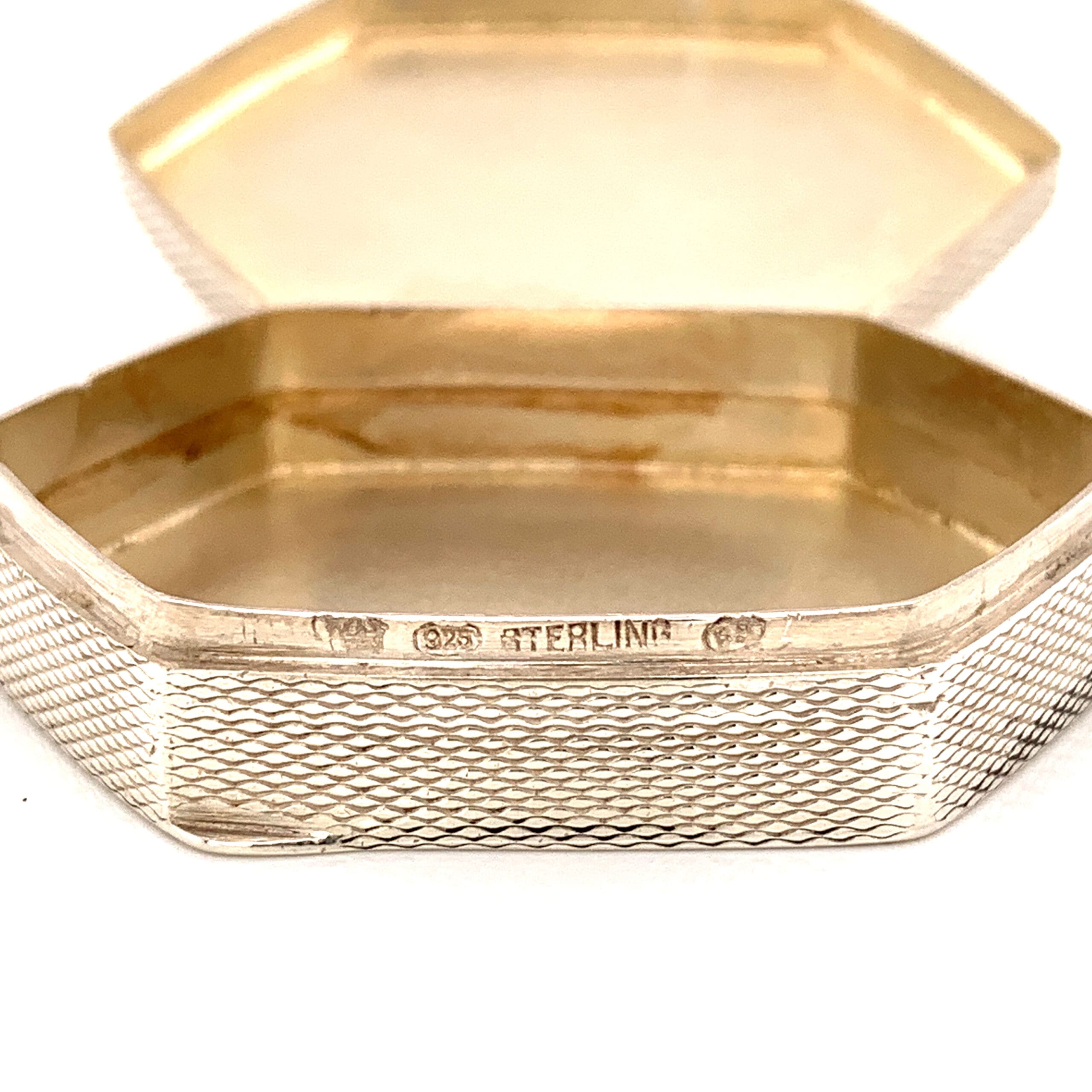 An attractive sterling silver hinged pill box with a textured surface and scroll engraved border. Sturdily made. Condition is good with some signs of wear.