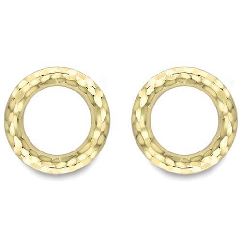 9 carat yellow gold textured circles that sit flat to the ear lobe. Fitted with posts and scroll backs.