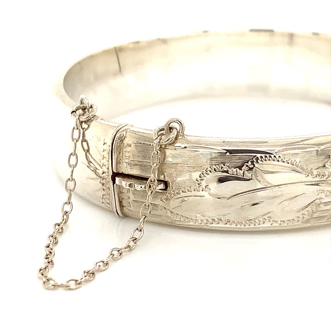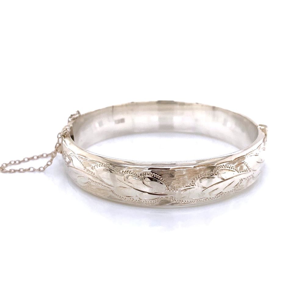 A pretty hinged silver bangle with a leaf engraved top and plain back. With safety chain.