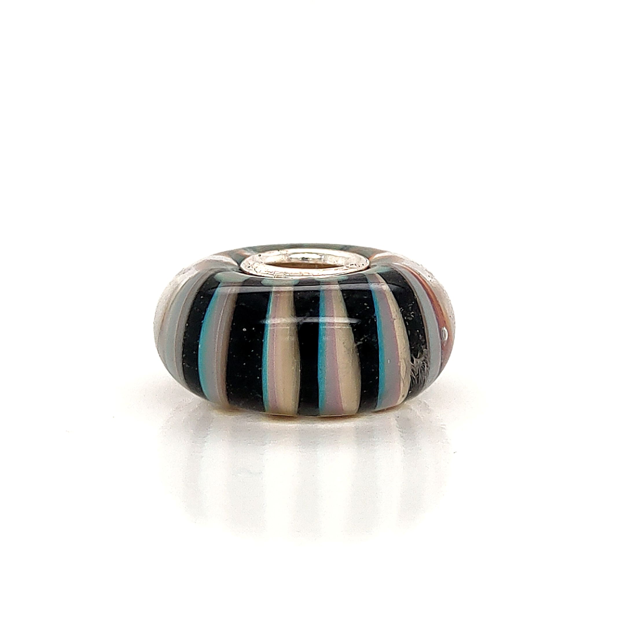 Khaki green with a hint of blue and pink. Alternating stripes of frosted and transparent glass, sifting light into the bead in colourful patterns.