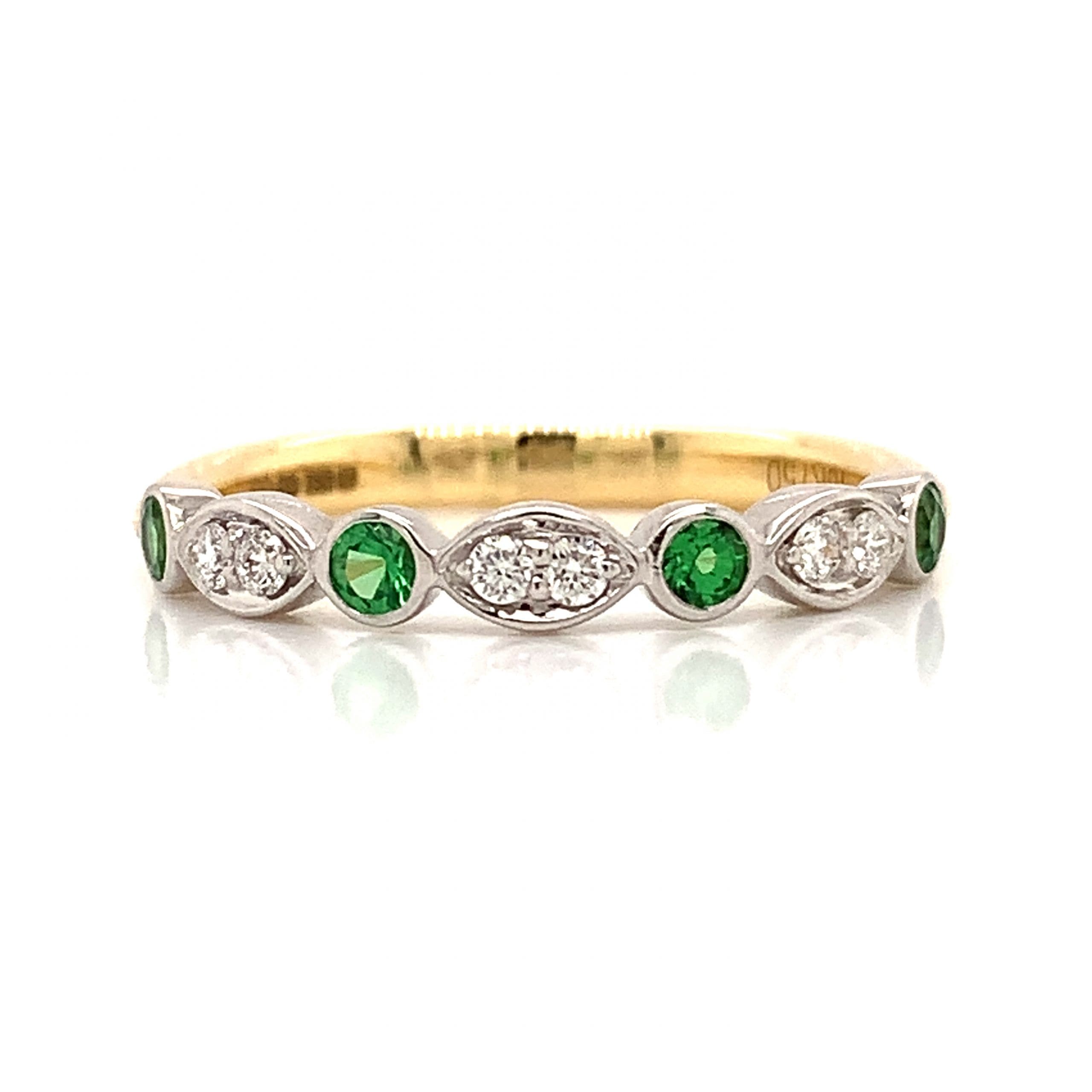 An elegantly shaped half eternity ring with four rub-over set round faceted tsavorites and six small brilliant cut diamonds grain set within elliptical elements. Made with a white gold setting and yellow gold ring shank.