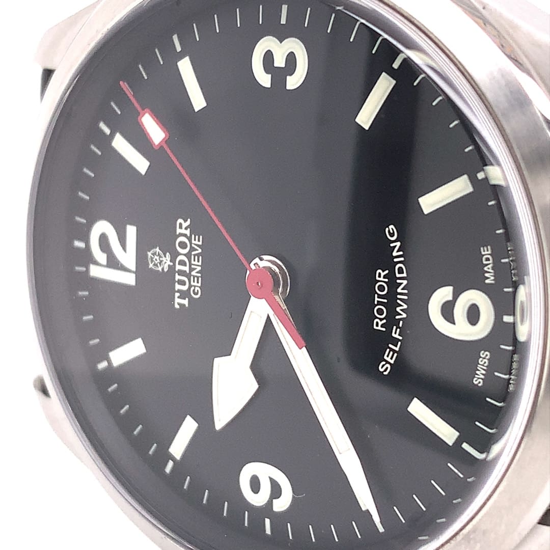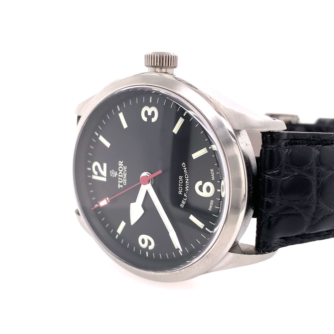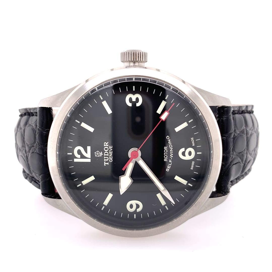 Tudor Heritage Ranger watch with automatic self-winding movement. Brushed stainless steel case with flowing lines. The dial is matt black with off-white numerals, batons and hands with striking red seconds hand. Hour markers and hands are luminescent. Comes with black leather genuine crocodile strap with stainless steel folding clasp plus alternative green camo nato strap.