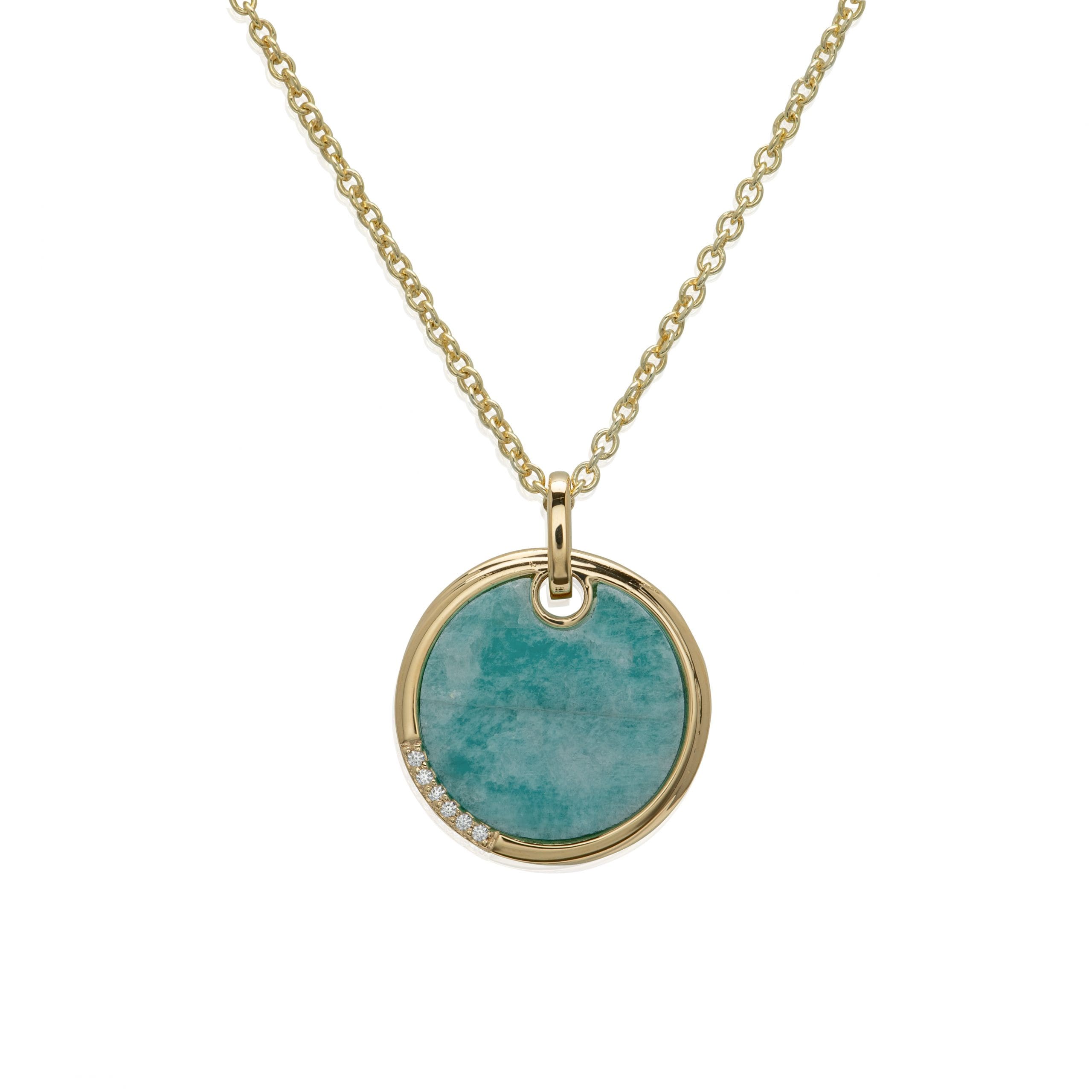 A tactile disc pendant and chain inset with amazonite and a row of sparkling CZ.