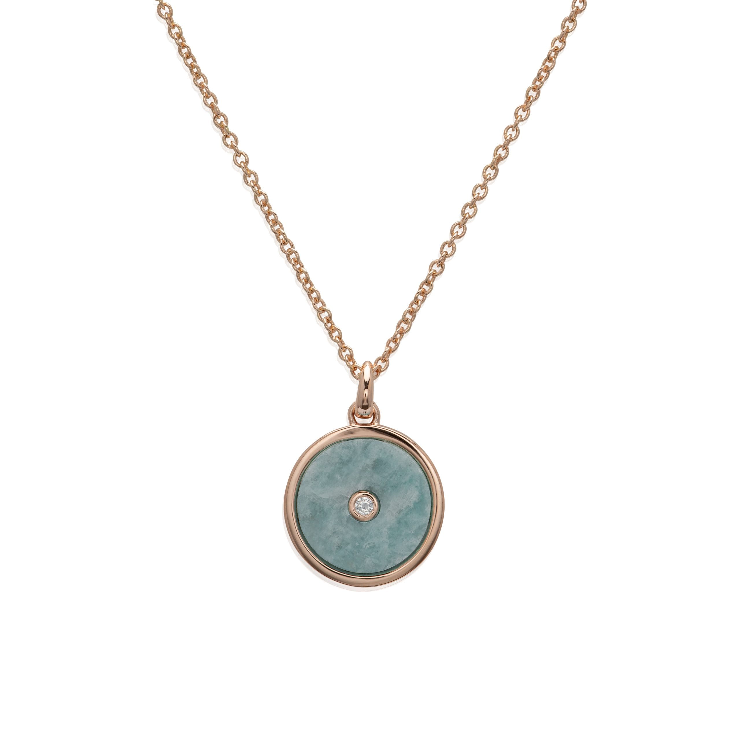 Soft green amazonite inset in a rose gold plated pendant and chain and set with a central sparkling CZ.