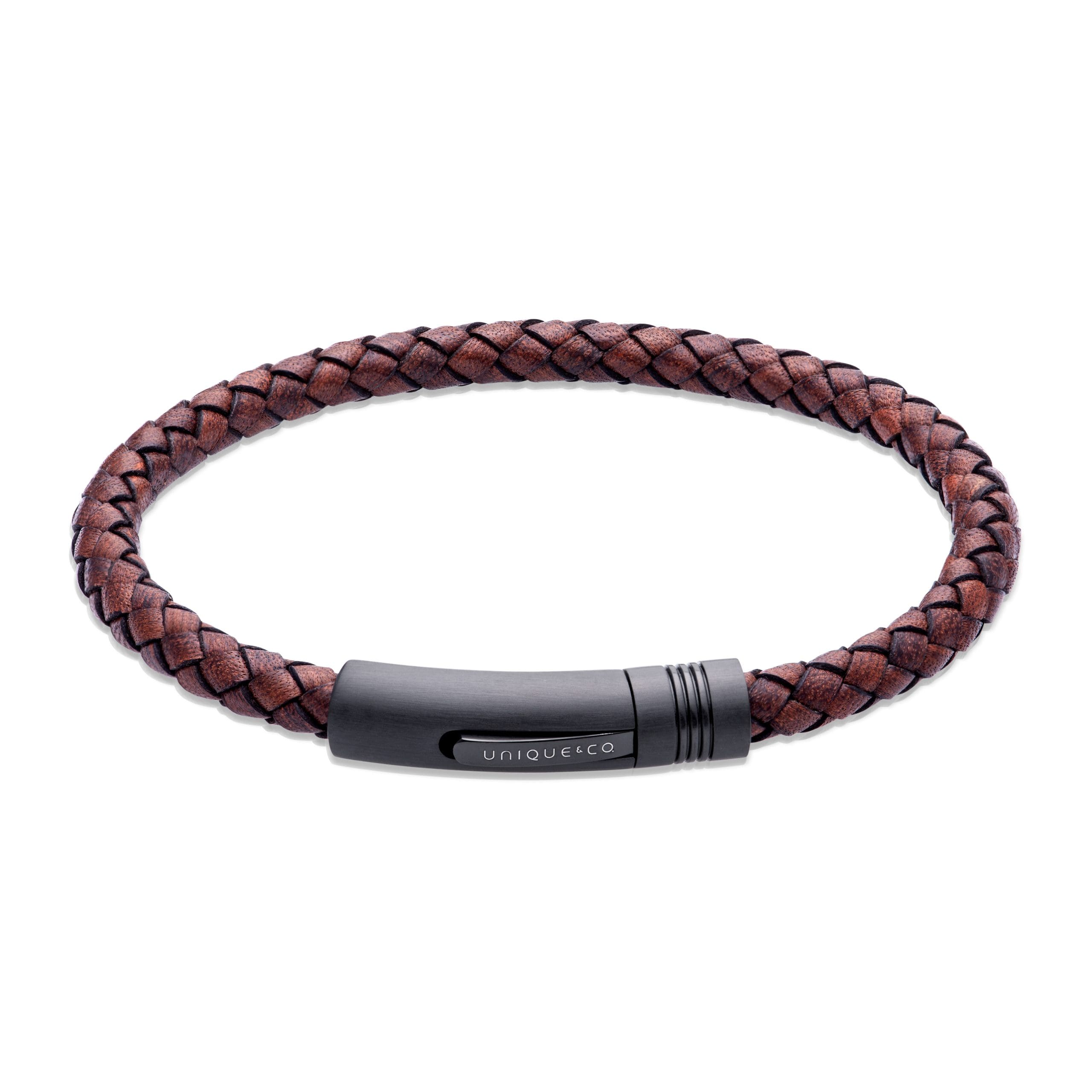 Unique gents antique brown leather bracelet with black IP matte and polished clasp.