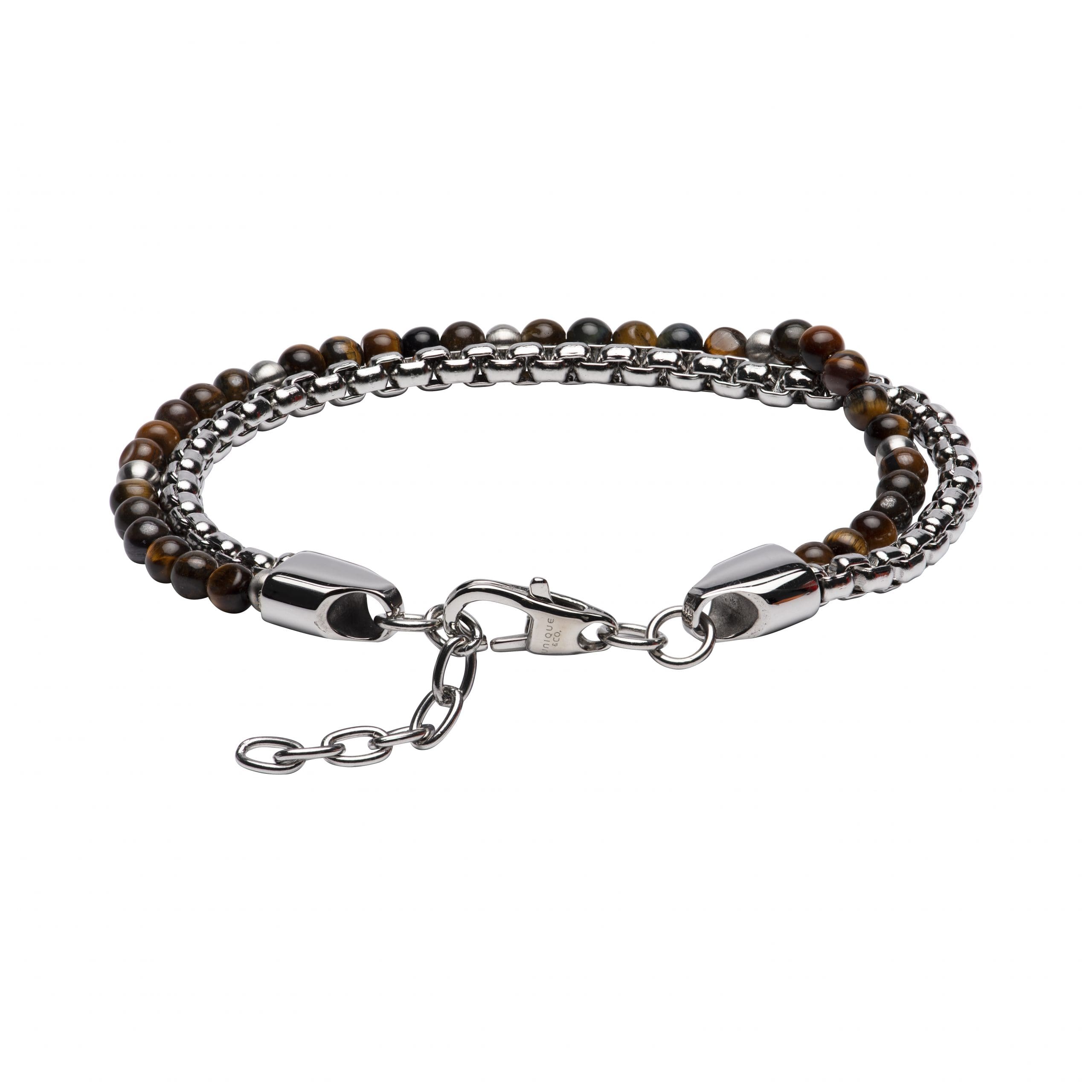 A double strand gents bracelet comprising of one row of tigers eye beads and one row stainless steel.