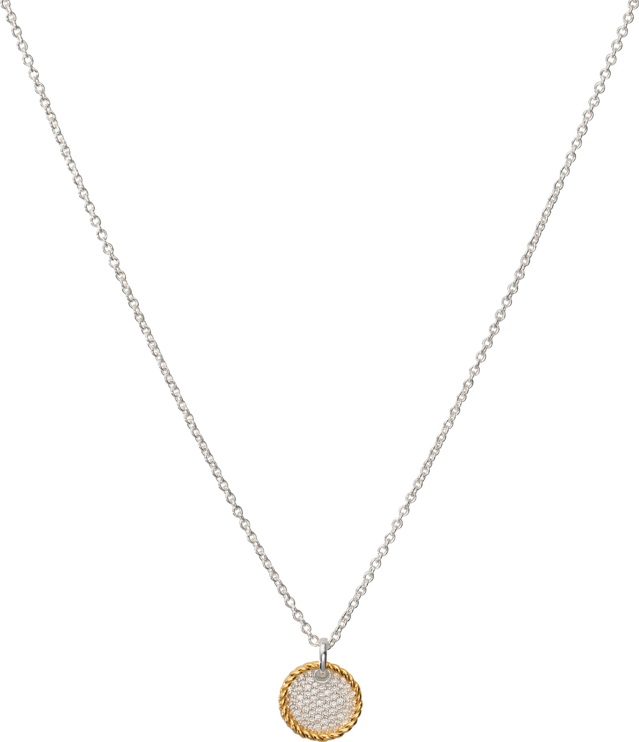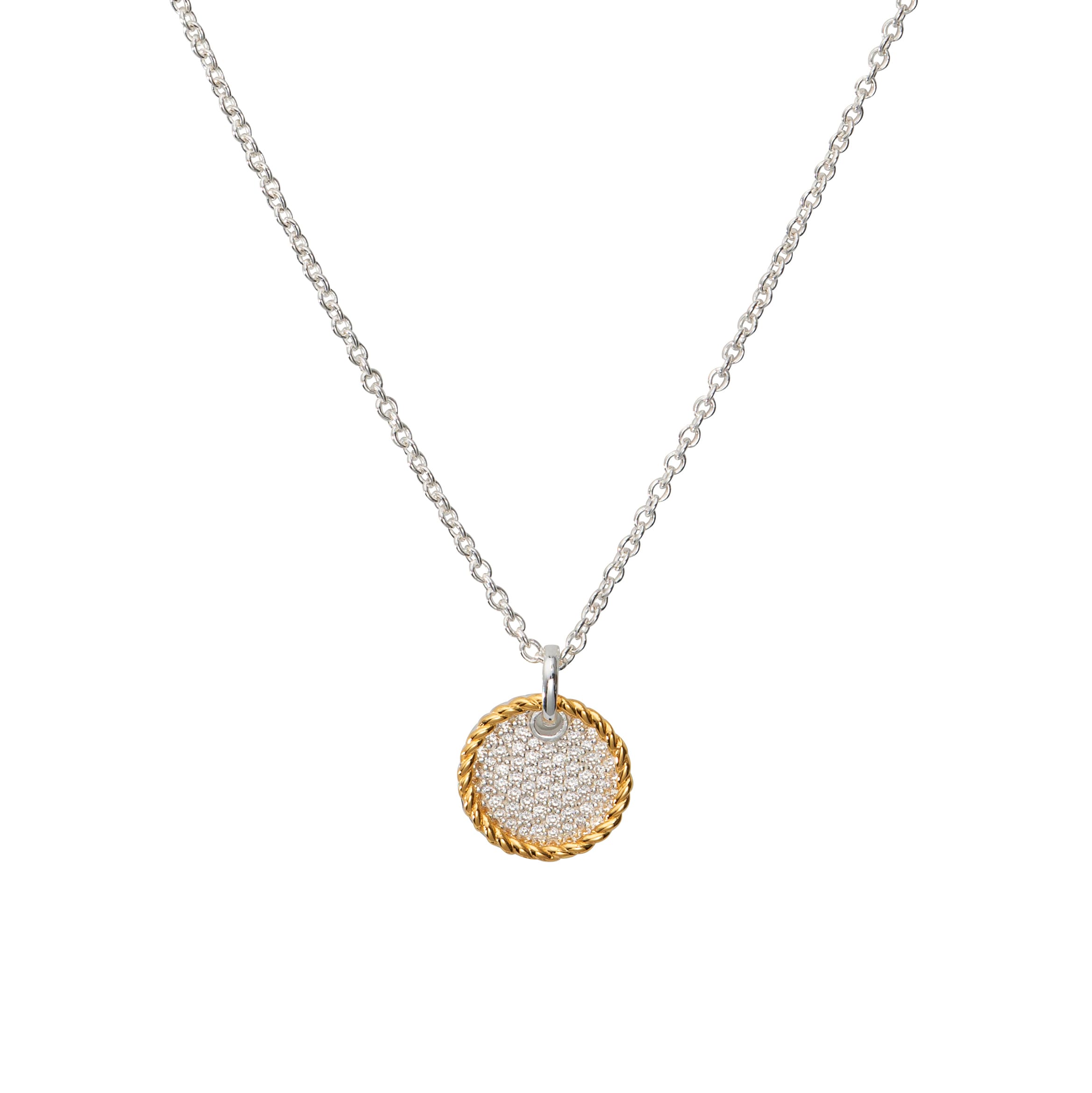 A pretty layered pendant comprising a sparkling CZ pave disc and gold plated twist ring.