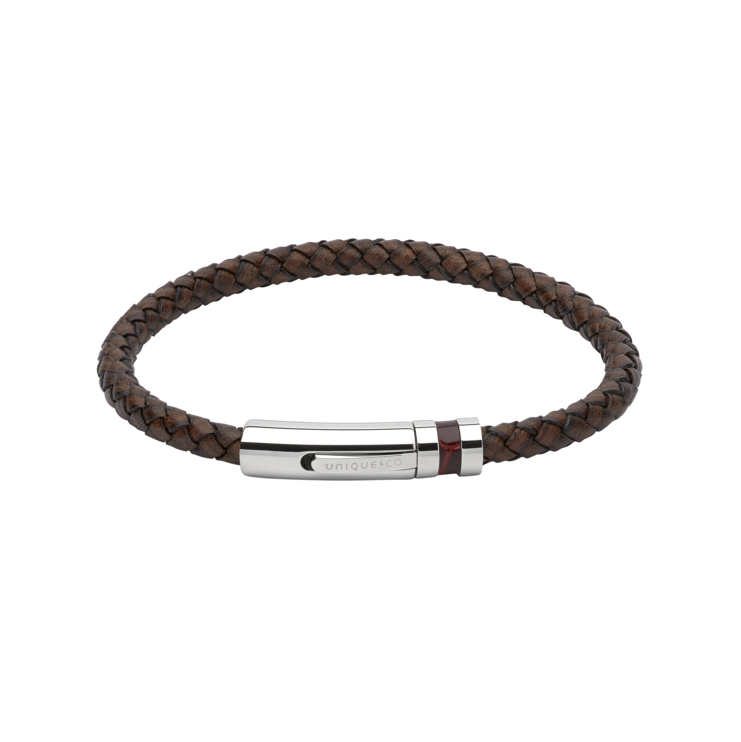 Unique gents antique dark brown leather bracelet with a blue leather inlay in the stainless steel clasp.
